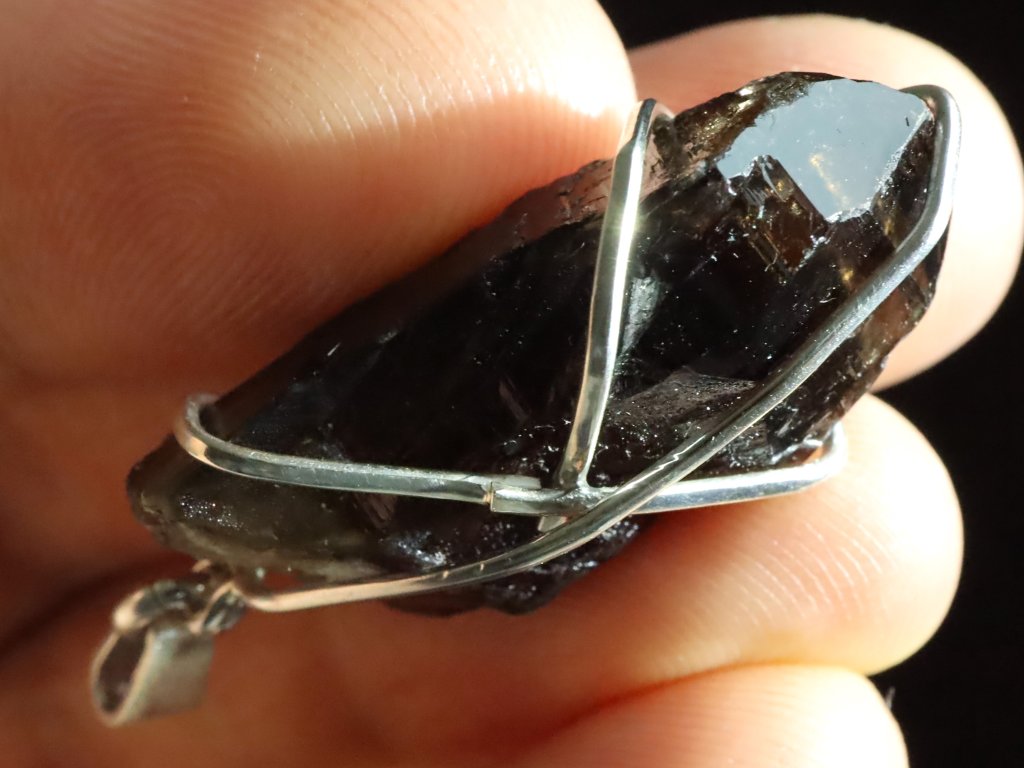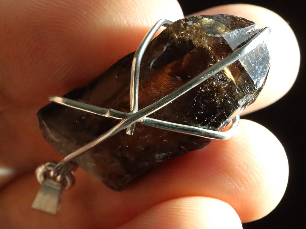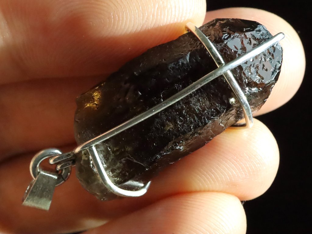 Tento originálně zpracovaný přívěsek ukrývá opravdovou vzácnost a sice krystalek morionu s velmi kvalitní černou barvou.