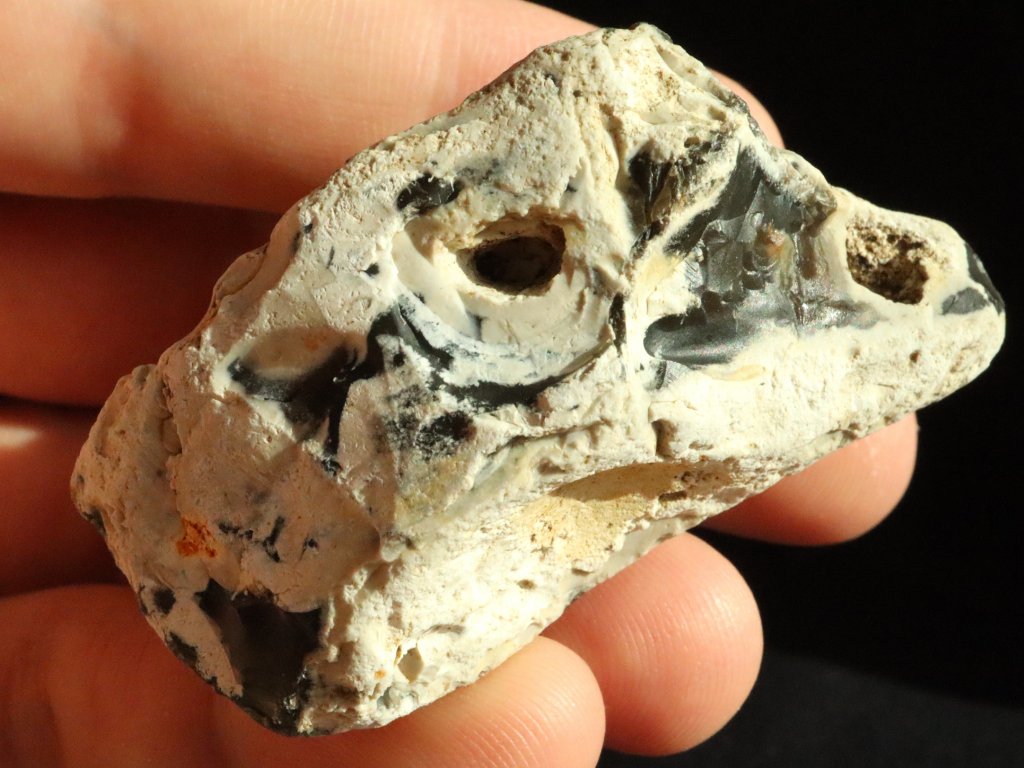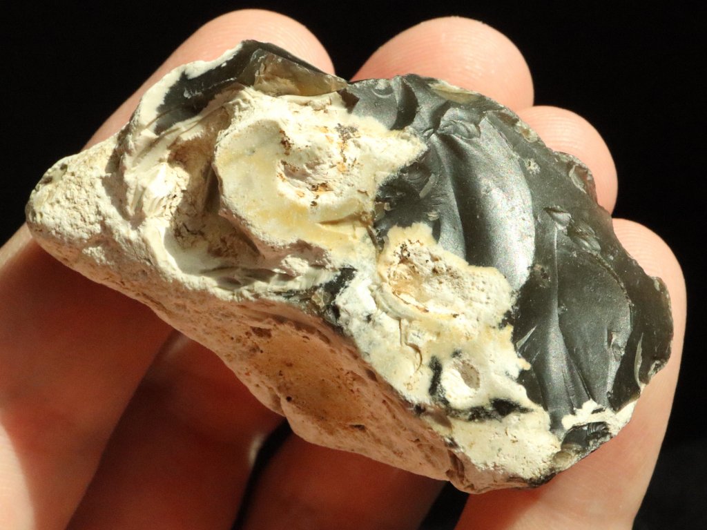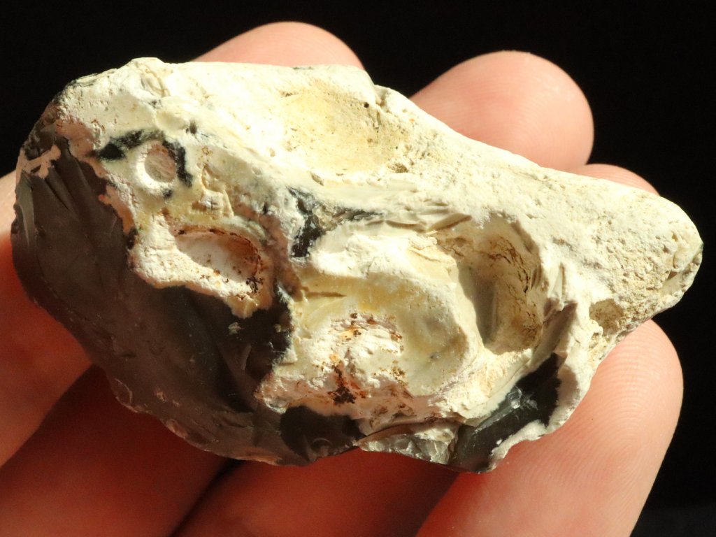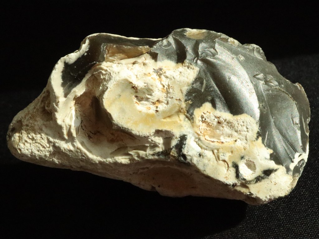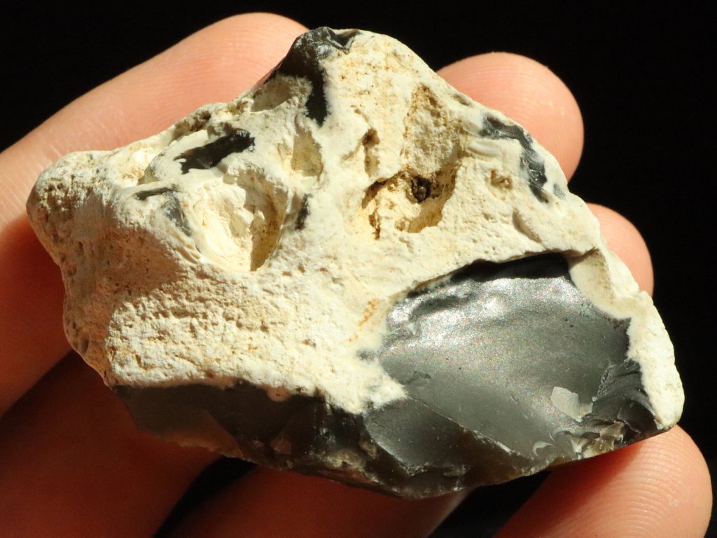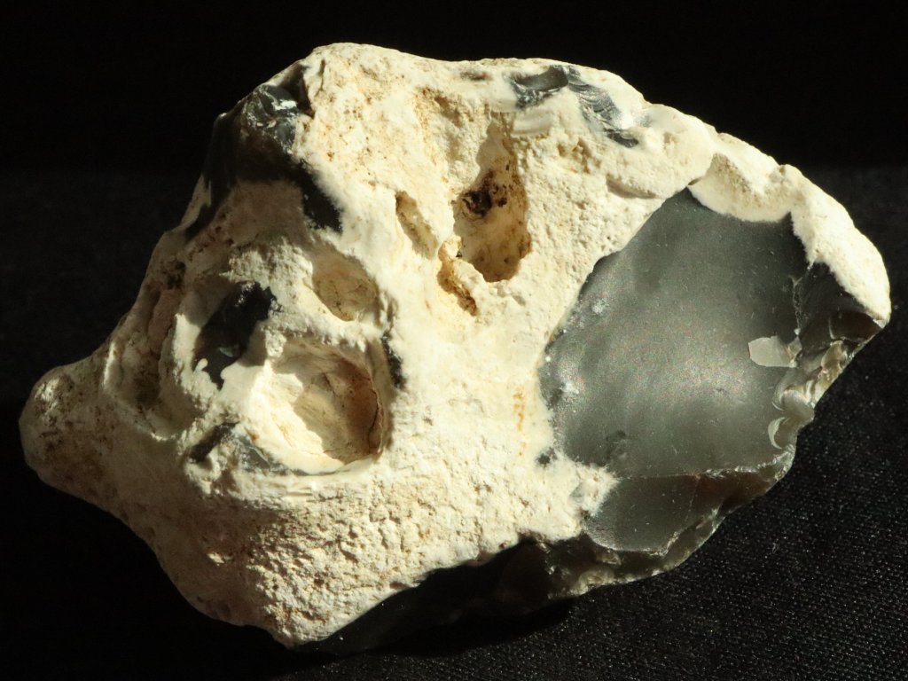 Pazourek má typickou tmavě šedou barvu a zajímavou bílou krustu.