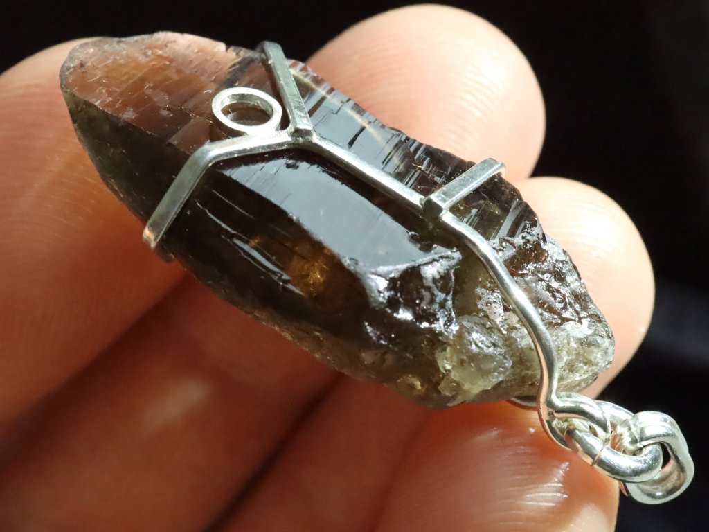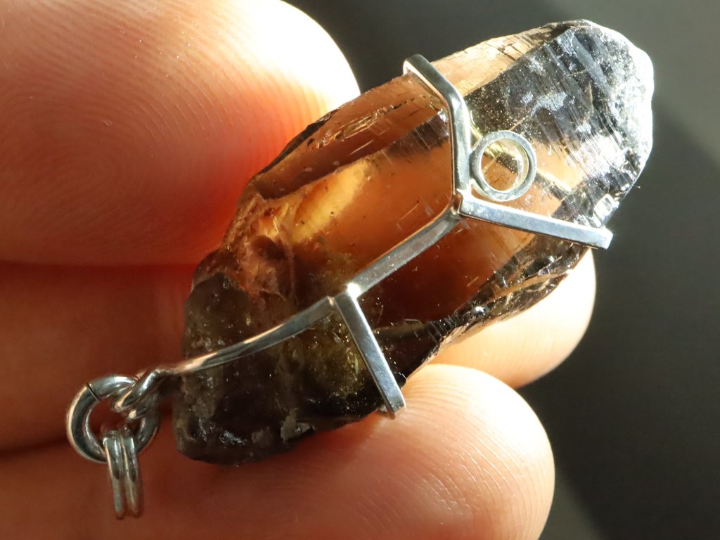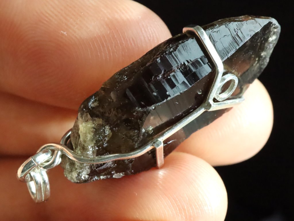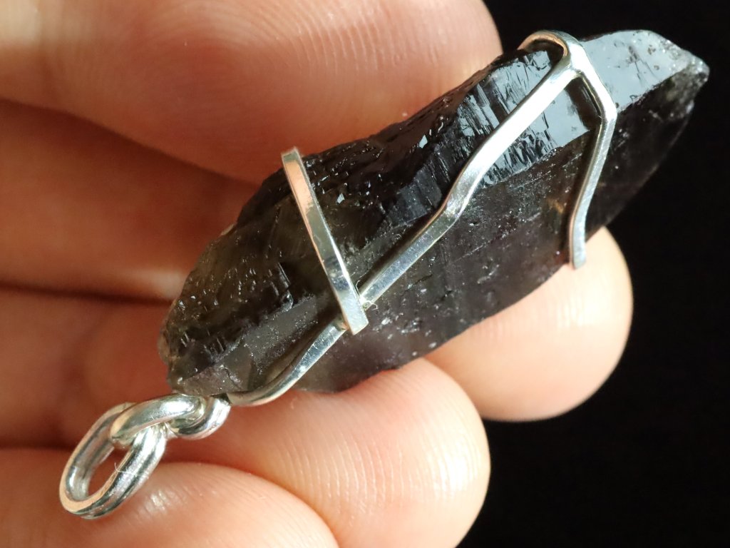 V tomto propracovaném stříbrném přívěsku se ukrývá krásný plochý krystalek morionu.