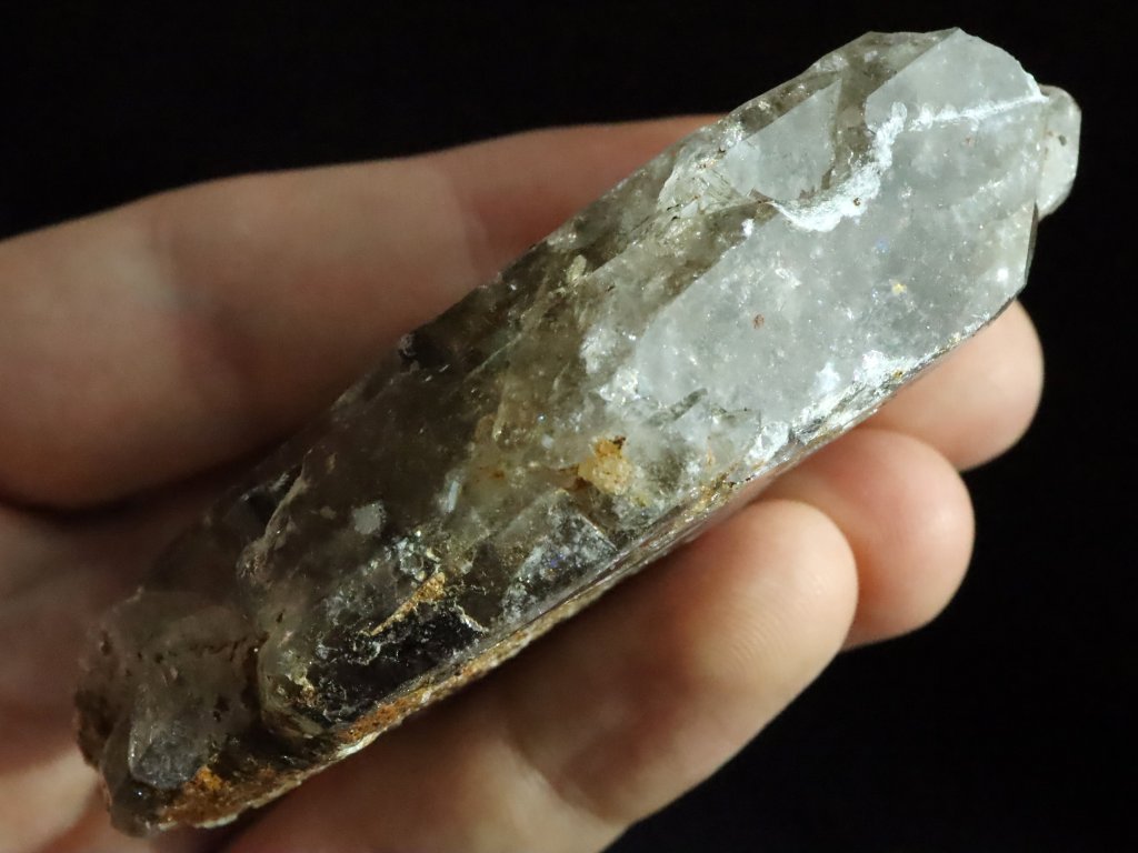 Záhněda má příjemný kouřový odstín, který ve střední části krystalu přechází téměř až do černého morionu.