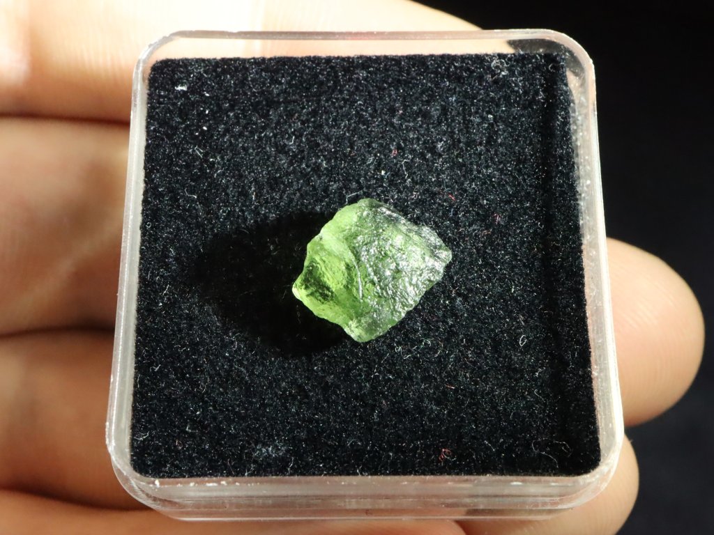 Vltavín obdržíte v kvalitní (hodnotné) uzaviratelné průhledné plastové krabičce s polstrovaným vnitřkem - viz. foto. Kamínek se vám tak nejen nikam nezatoulá, ale zároveň se jím budete moci přes průhledné plastové víčko krabičky i skvěle kochat.