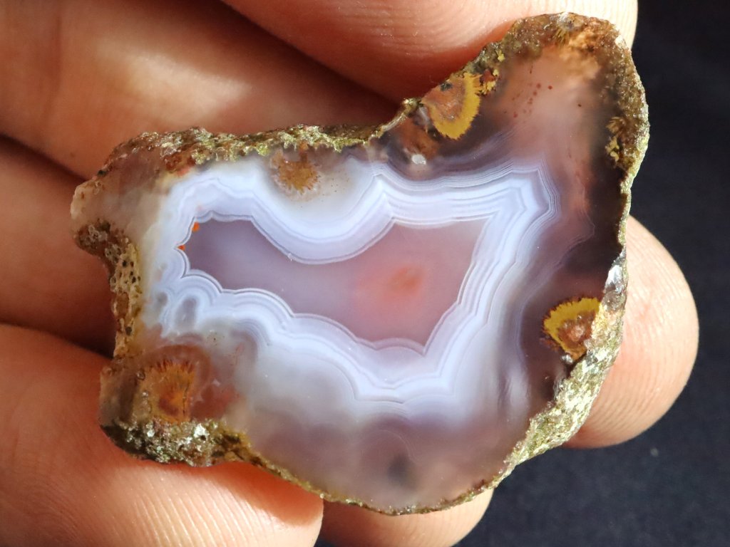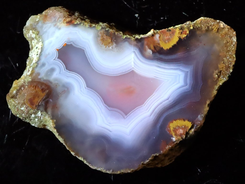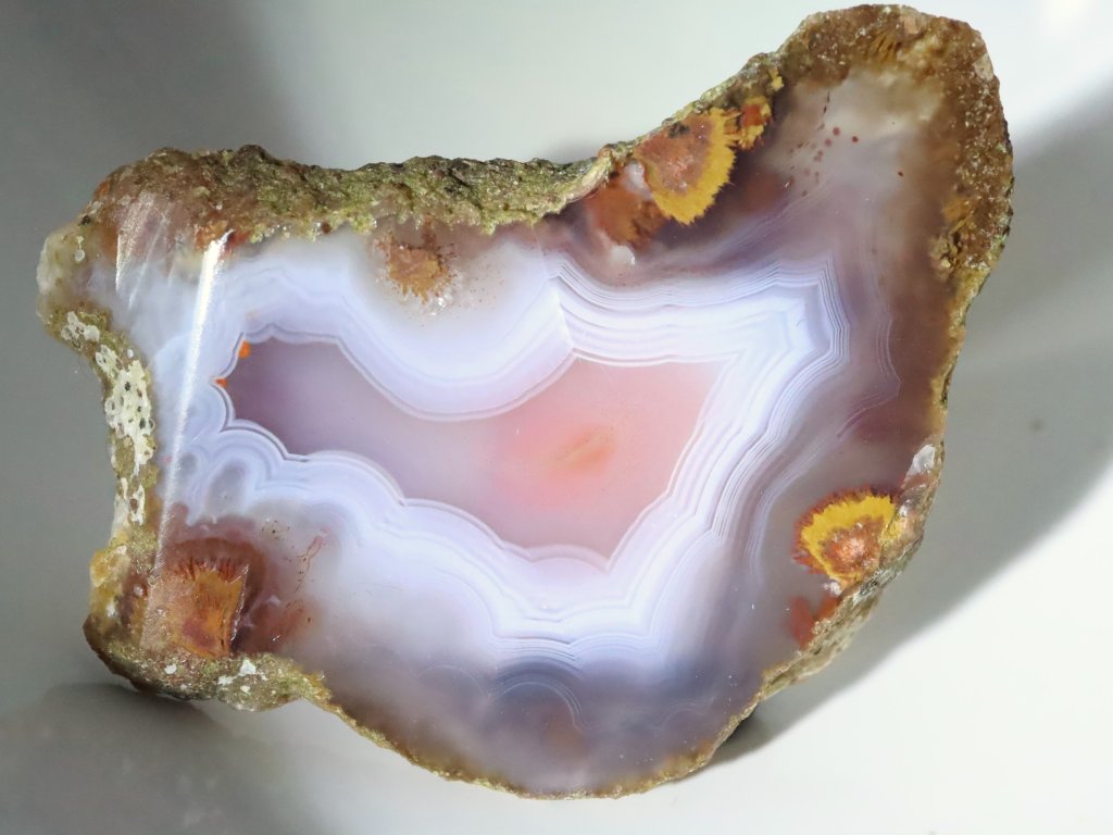 Tento achát má půvabnou bílou kresbu, čirý okrajový lem a jemně oranžový střed.