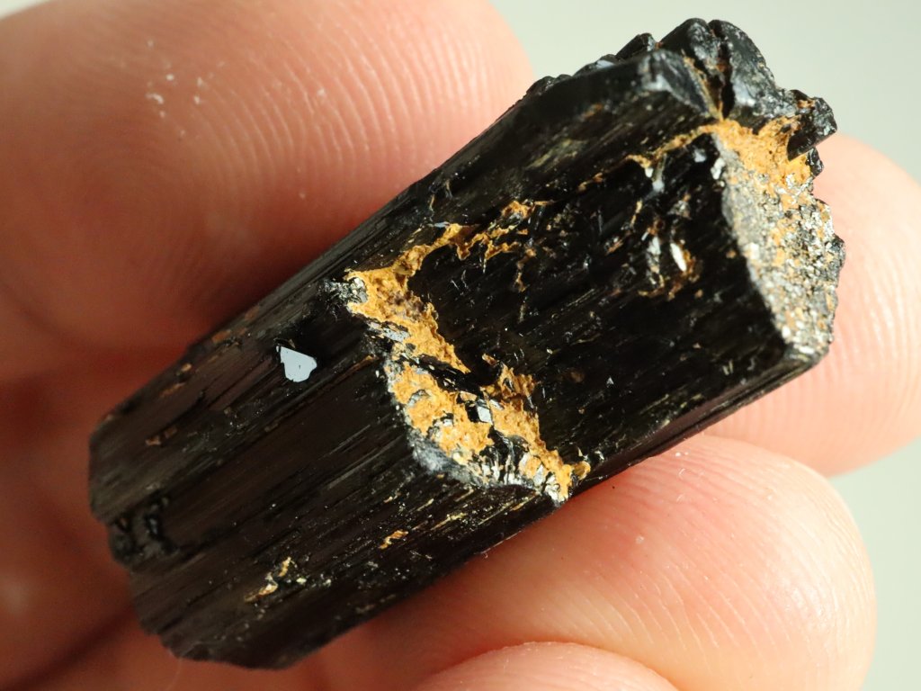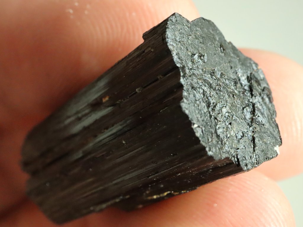 Černé turmalíny skoryly se v naší přírodě nejčastěji nacházejí v podobě krátkých válečků či špalíků, vzácněji se pak objeví i podlouhlé kousky jako je tento.