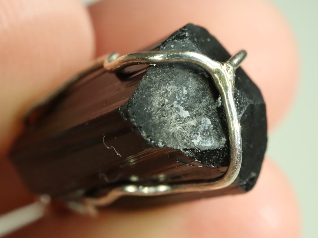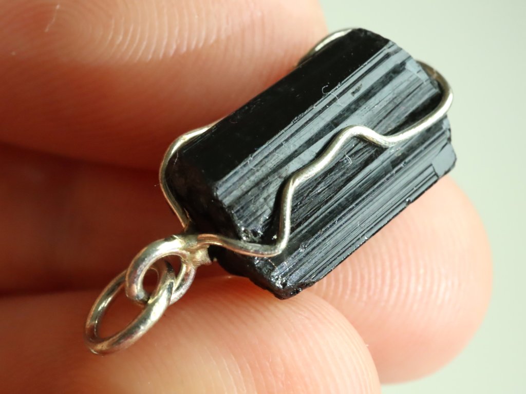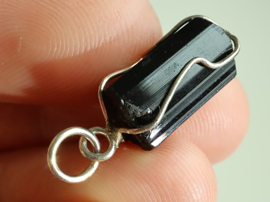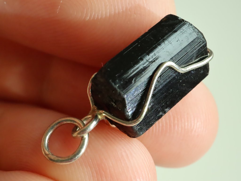 Přírodní černý turmalín s ukončením zasazený ve stříbrnném přívěsku