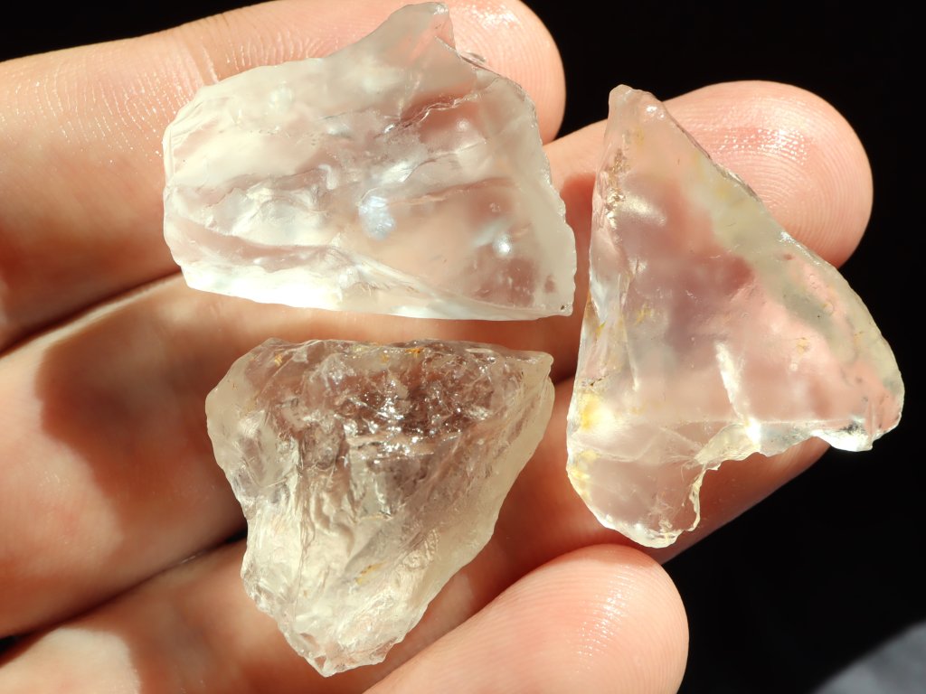 Křišťálky jsou skvěle průsvitné, jejich povrch je pak převážně matný místy nepatrně ohlazený, dva z kamínků však mají i lesklé pasáže.
