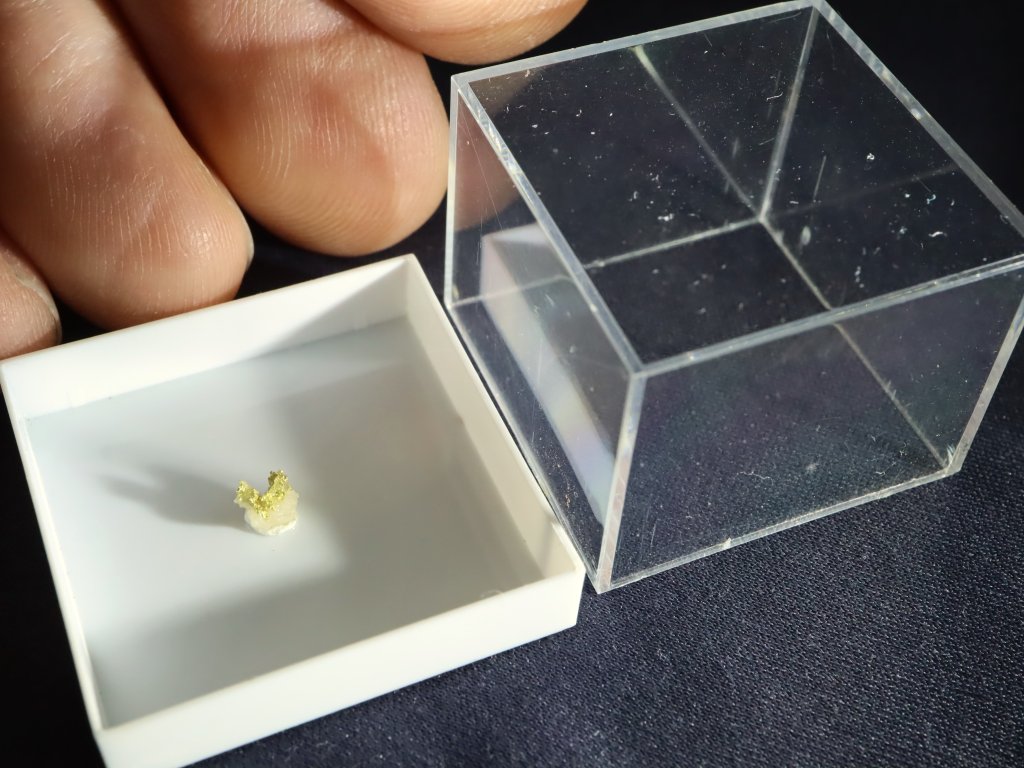 Součástí tohoto zlata je i plastová krabička (rozměr 28 x 28 x 22 mm), kterou můžete vidět na fotografiích. Vzorek je k plastovému podstavečku uchycený pouze pomocí mineralogického tmelu (speciální plastelíny) - viz. popis níže.