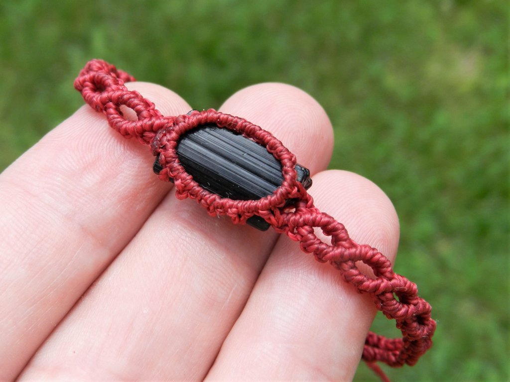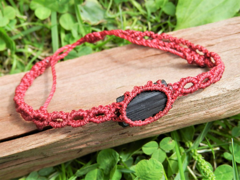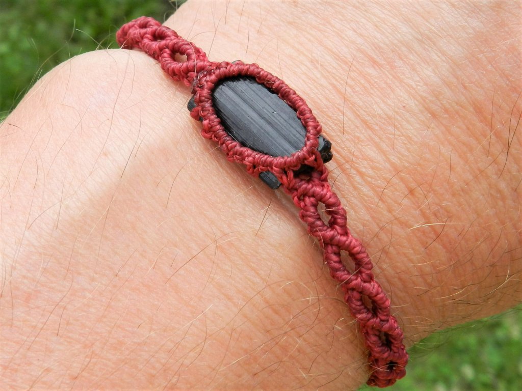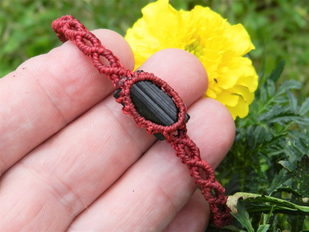 Pravý český turmalín skoryl v elegantním ručně dělaném macramé náramku s nastavitelným obvodem od 15 do 26 centimetrů.