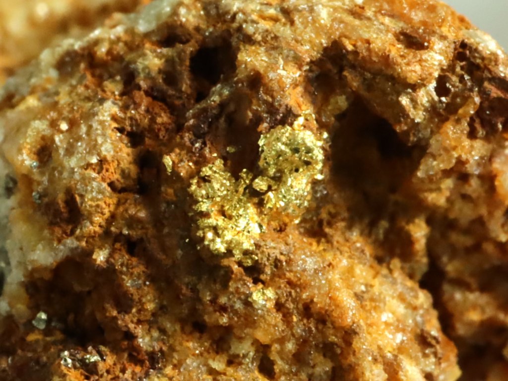 Atraktivní vzorek přírodního ryzího zlata na podložce (křemenné matrix) pocházející z proslavené zlatonosné lokality Zlaté Hory (Jeseníky).