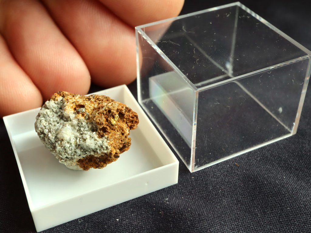 Součástí tohoto zlata je i plastová krabička (rozměr 28 x 28 x 22 mm), kterou můžete vidět na fotografiích. Vzorek je k plastovému podstavečku uchycený pouze pomocí mineralogického tmelu (plastelíny) - viz. popis níže.