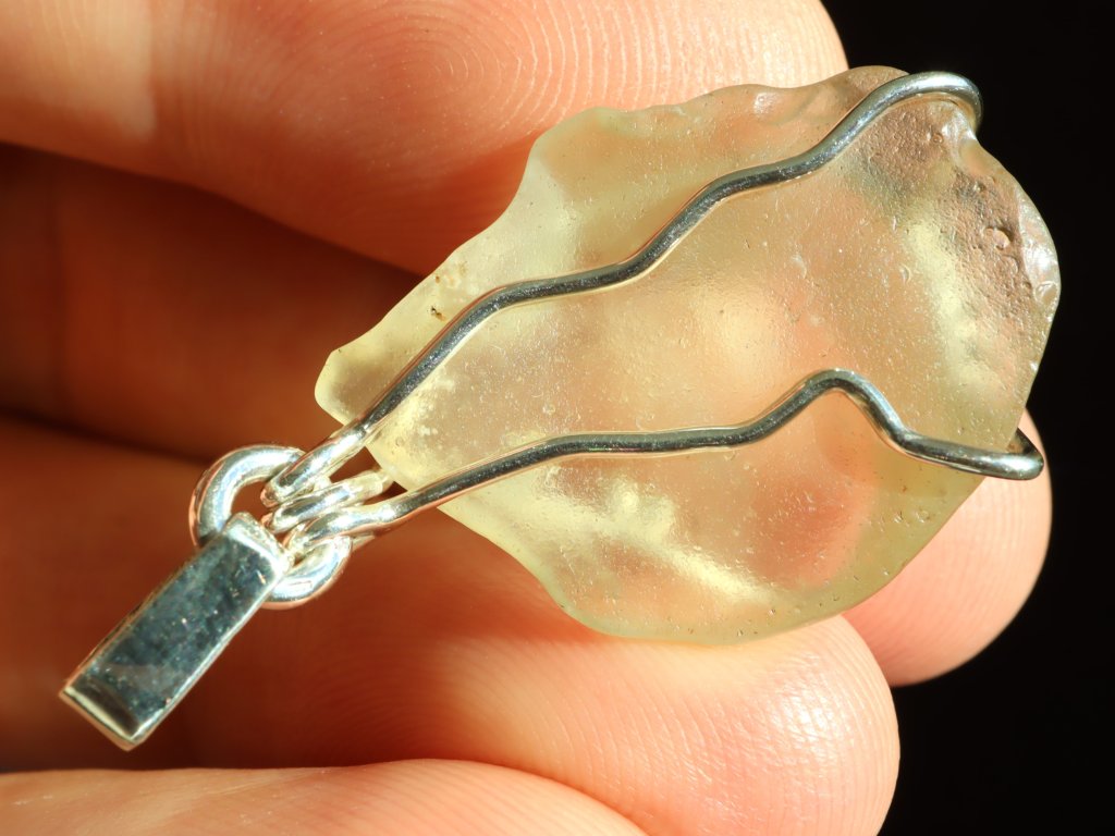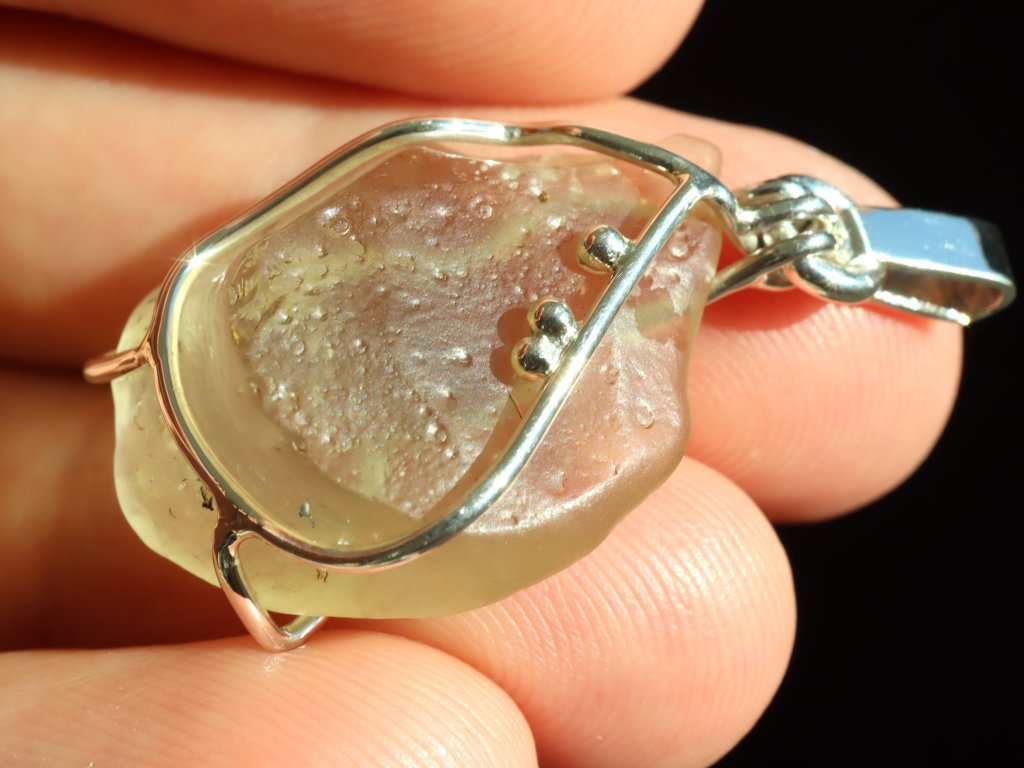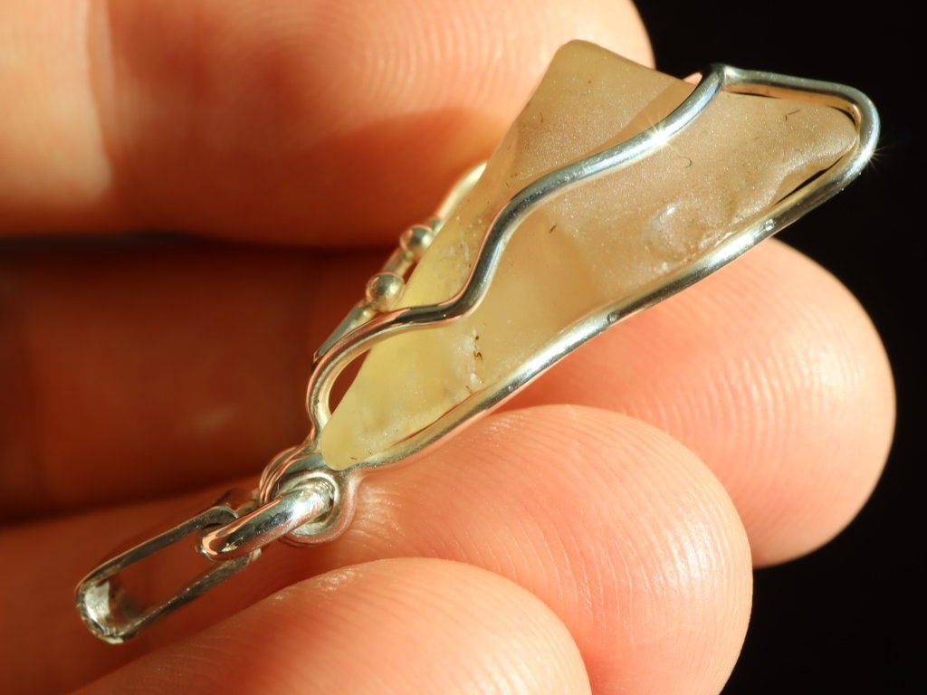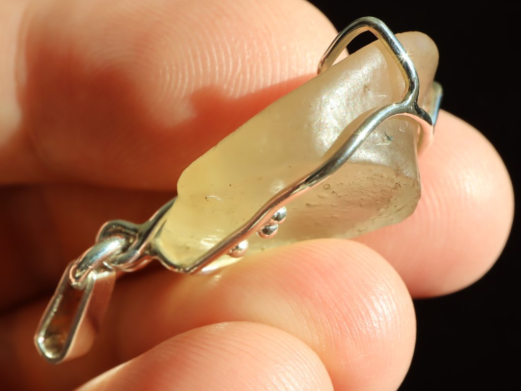 Kvalitní vzorek libyjského pouštního skla v precizně zpracovaném a zdobeném stříbrném přívěsku.
