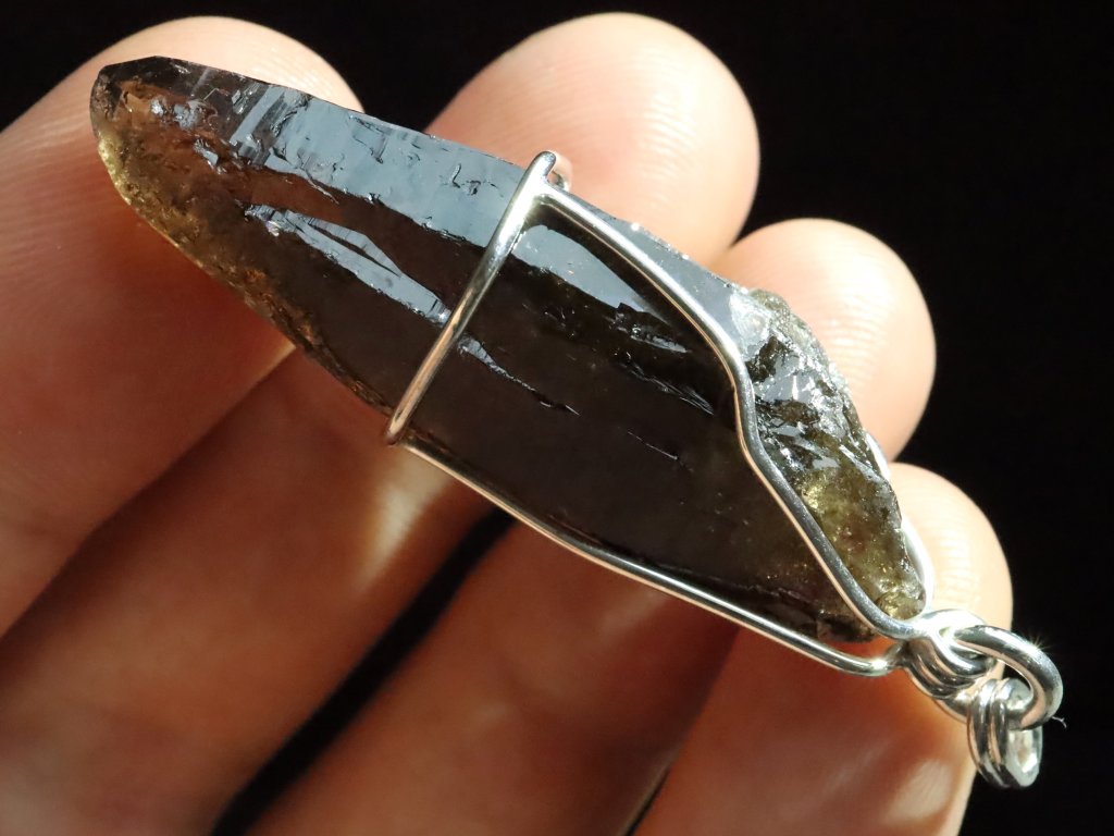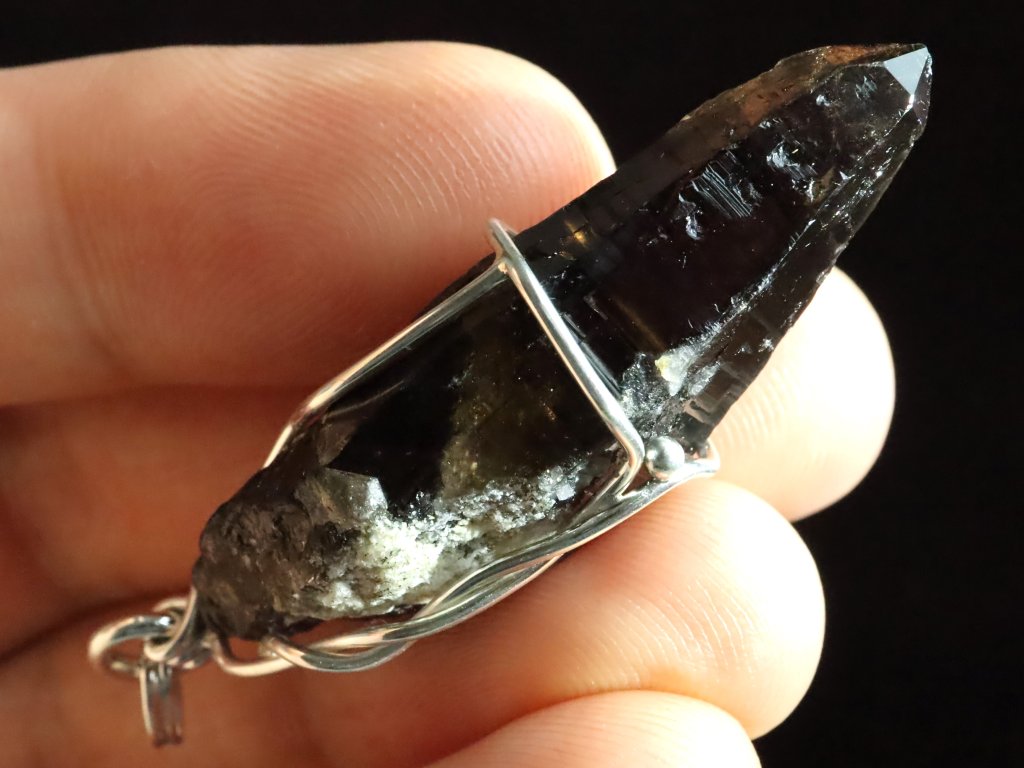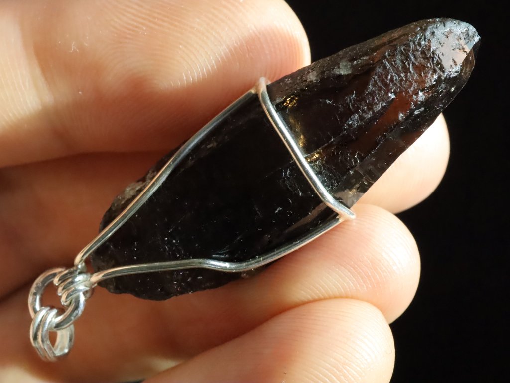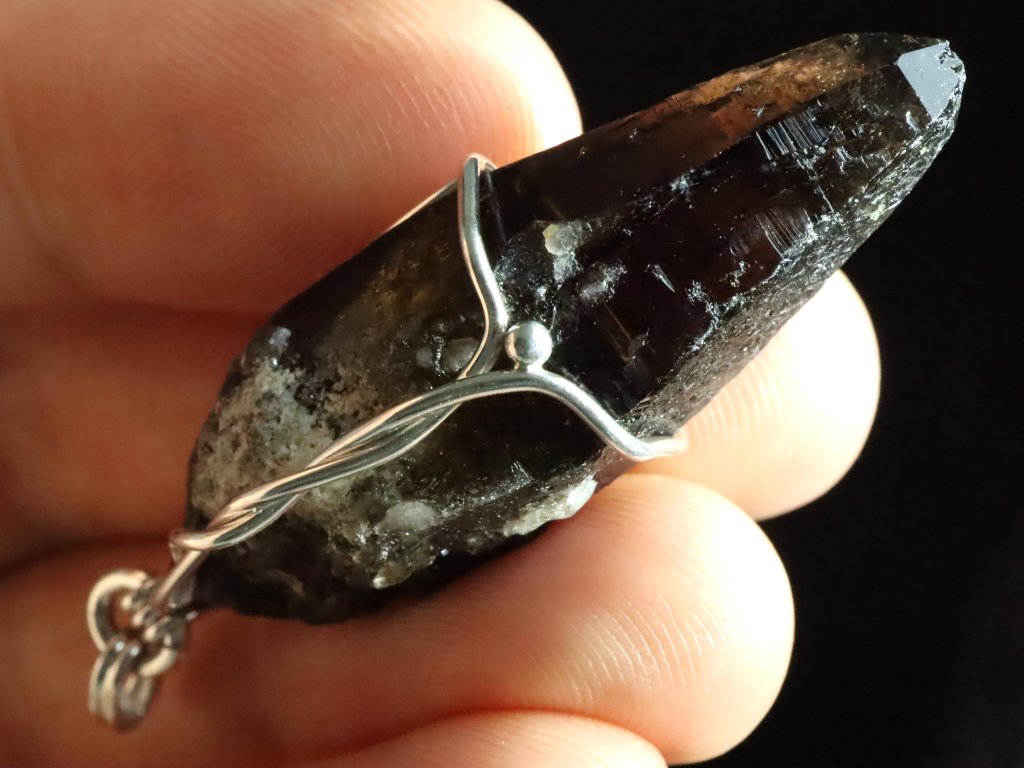 Protáhlý krystal černého morionu v elegantním stříbrném přívěsku