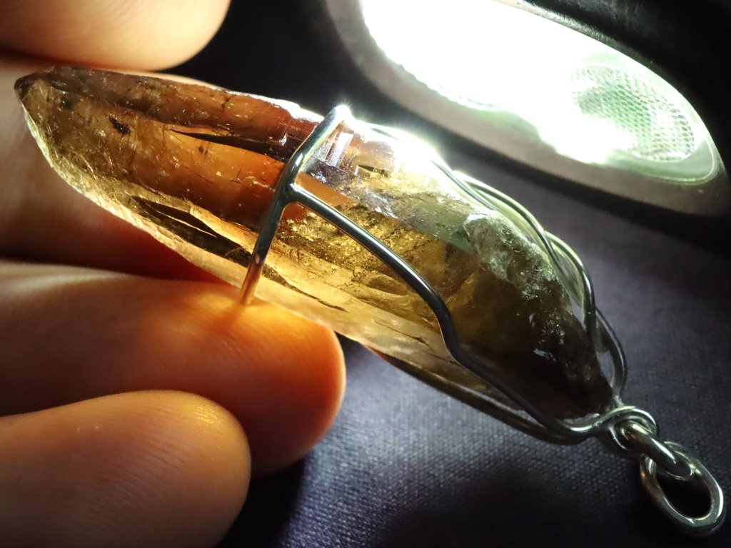 Při prosvícení můžete také solidně nahlédnout do vnitřního světa. Horní polovina krystalu se pyšní vysokou až drahokamovou čistotou, spodní polovina je pak decentně zakalená mlhovinkami a peříčky.