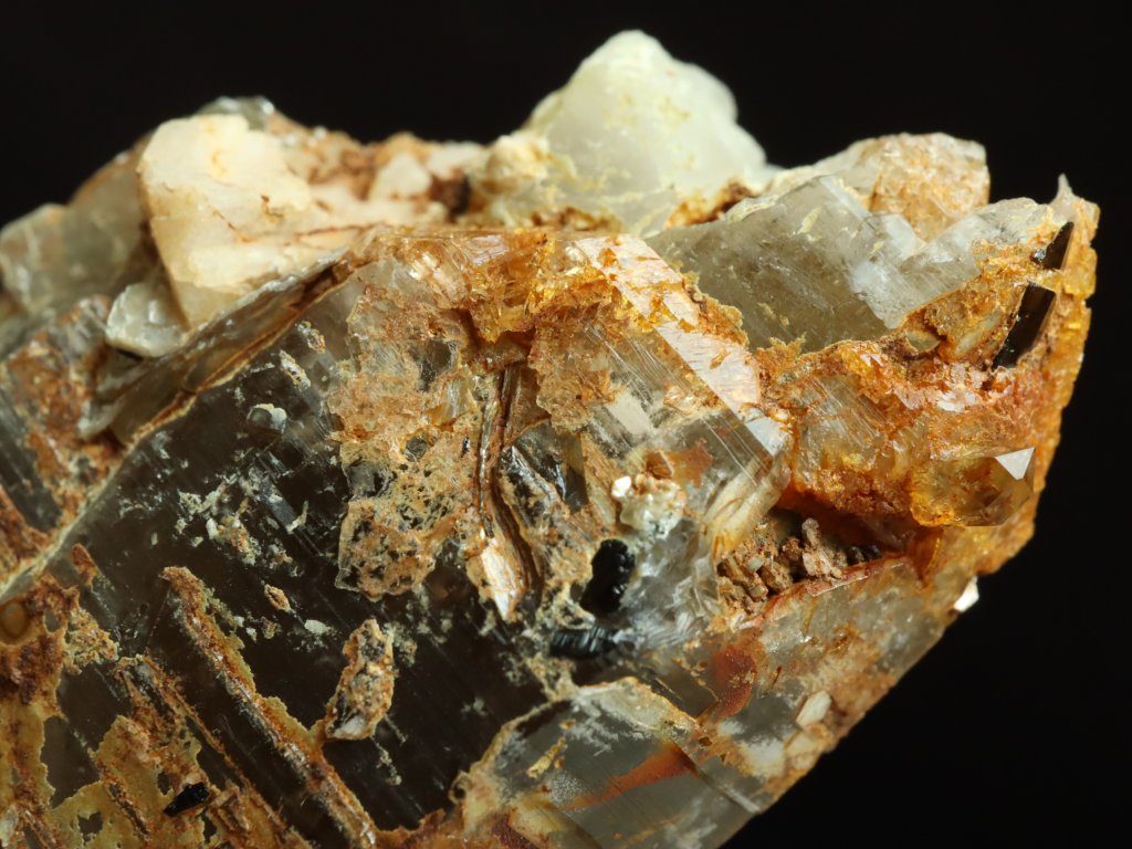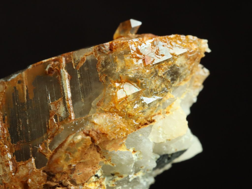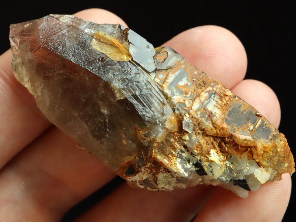 Místy je povrch krystalu pokrytý povlakem oranžového limonitu, najdete tu však i stříbrné lupínky muskovitu nebo-li světlé lesklé slídy. Za zmínku stojí i menší přítomnost křemene v základně se zarostlými kousky černých trumalínků.