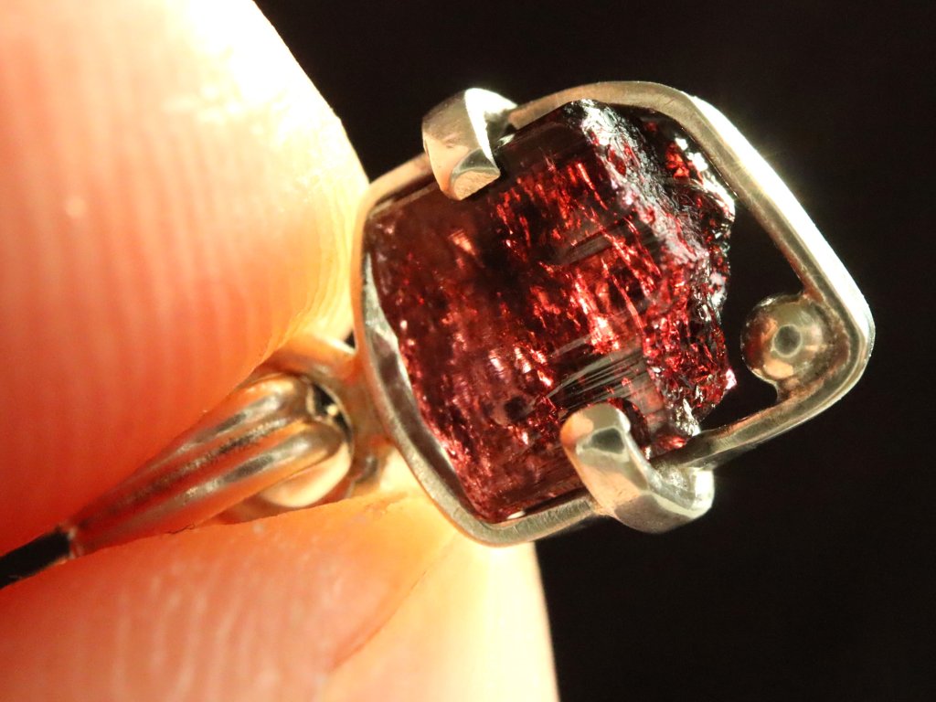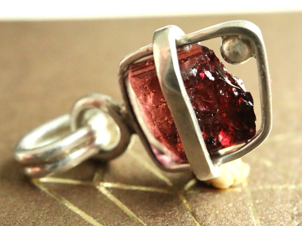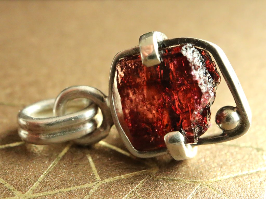 Rubelit je nápaditě a precizně zasazen ve stříbře (925/1000). Jedná se o jedinečný šperk s čistě přírodním a surovým kamenem, který není žádným způsobem opracovaný a je ponechaný v původním stavu, ve kterém byl v naší přírodě nalezen.