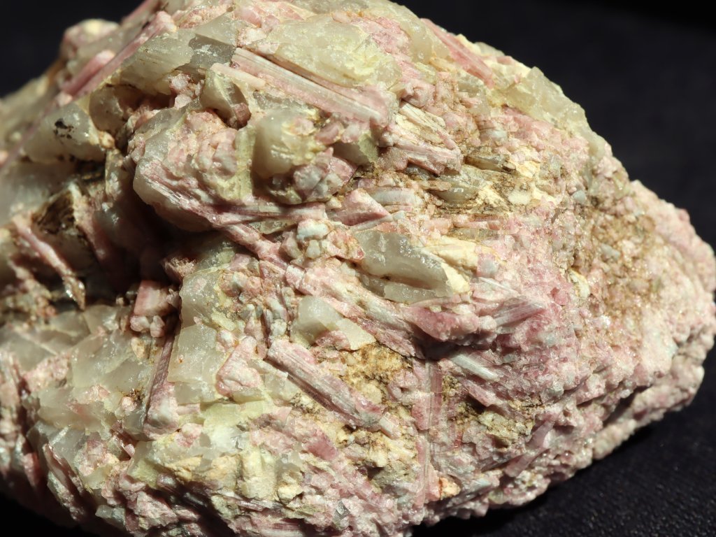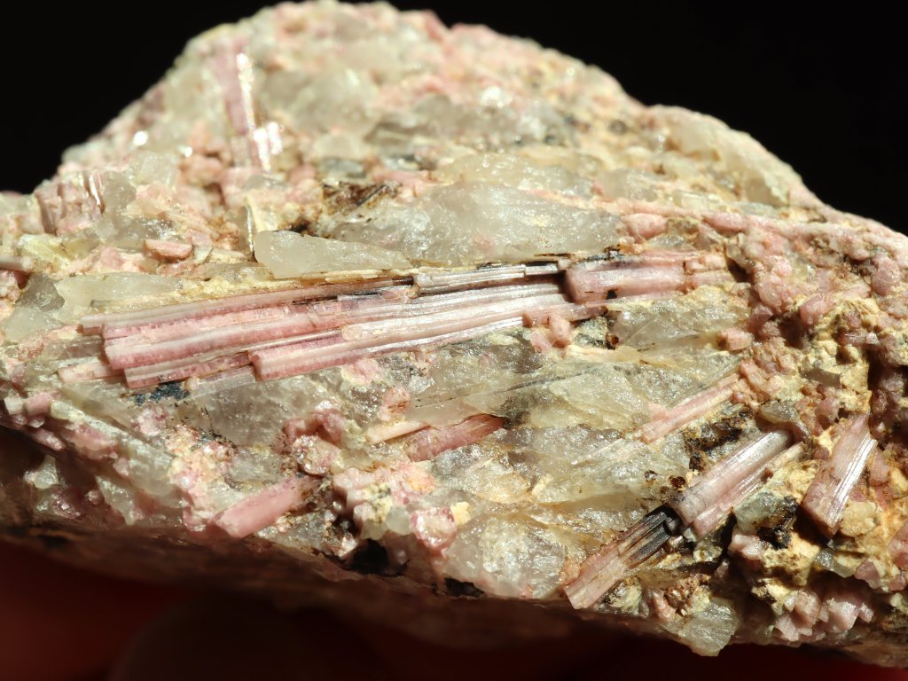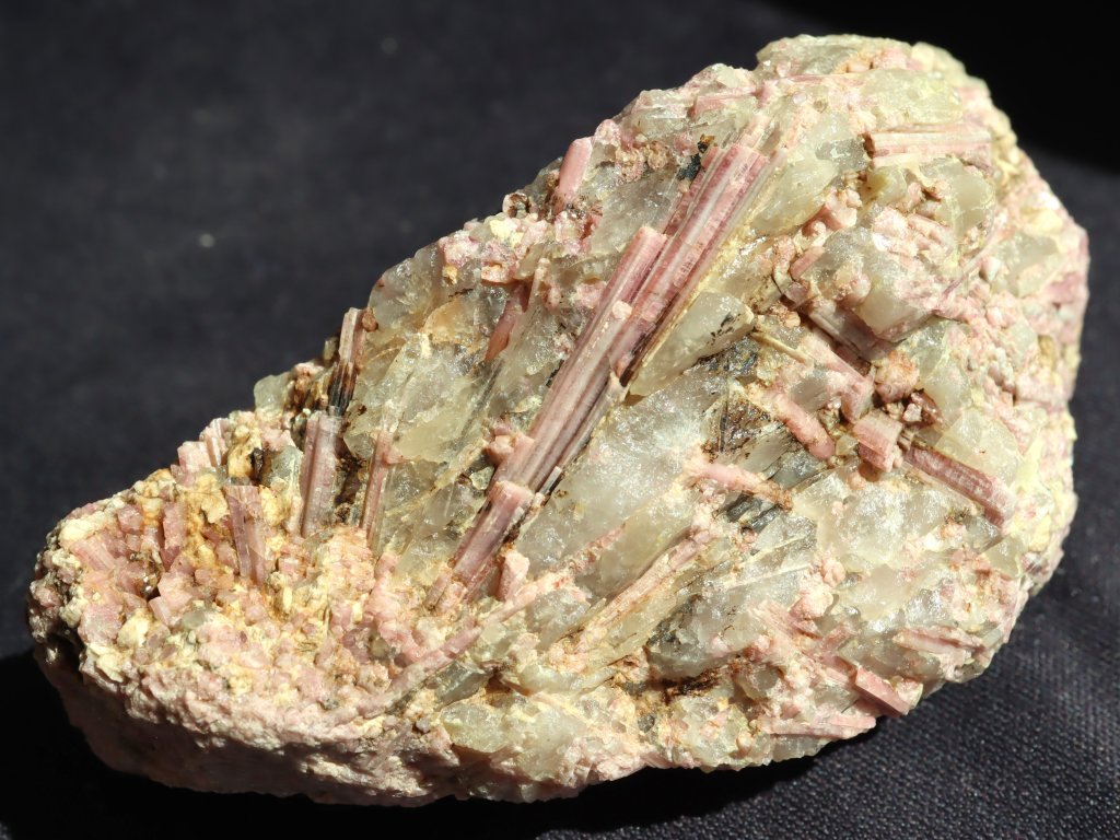 Na tomto kousku můžete z pohledové strany obdivovat bohatou ukázku růžového turmalínu rubelitu a to ve formě krátce ale i dlouze sloupcovitých až jehlicovitých krystalků.
