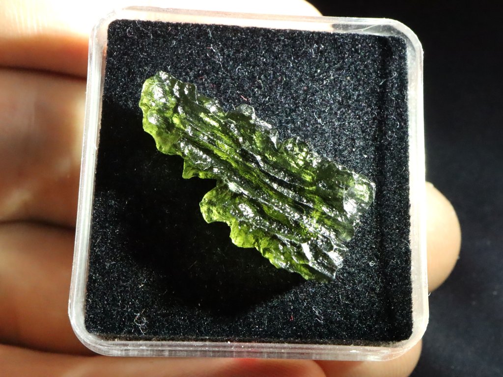 Vltavín obdržíte v kvalitní (hodnotné) uzaviratelné průhledné plastové krabičce s polstrovaným vnitřkem - viz. foto.