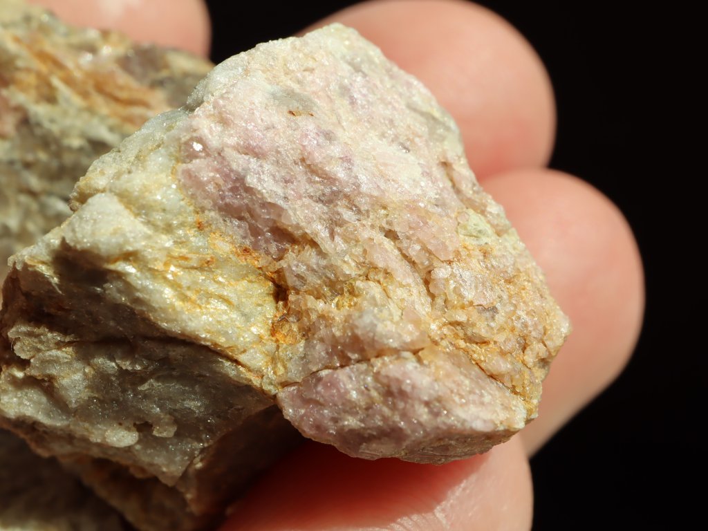 Na jednom kamínků jsou k vidění i lupenité krystalky světle fialového lepidolitu.