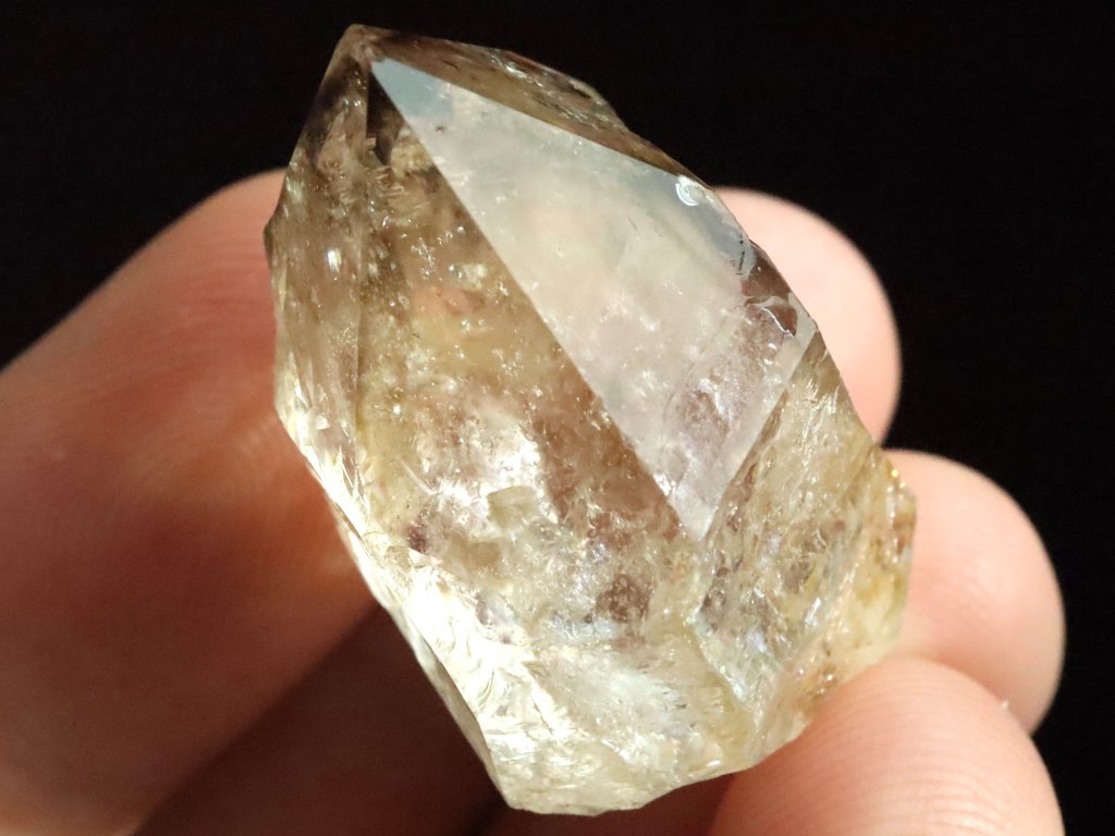 Sluníčkem či baterkou je krystalek skvěle průsvitný, přičemž lesklé stěny dovolují celkem dobře nahlédnout do vnitřního světa. Tam se kromě slušné čistoty ukrývá i množství mlhovinových závojů a drobných peříček.