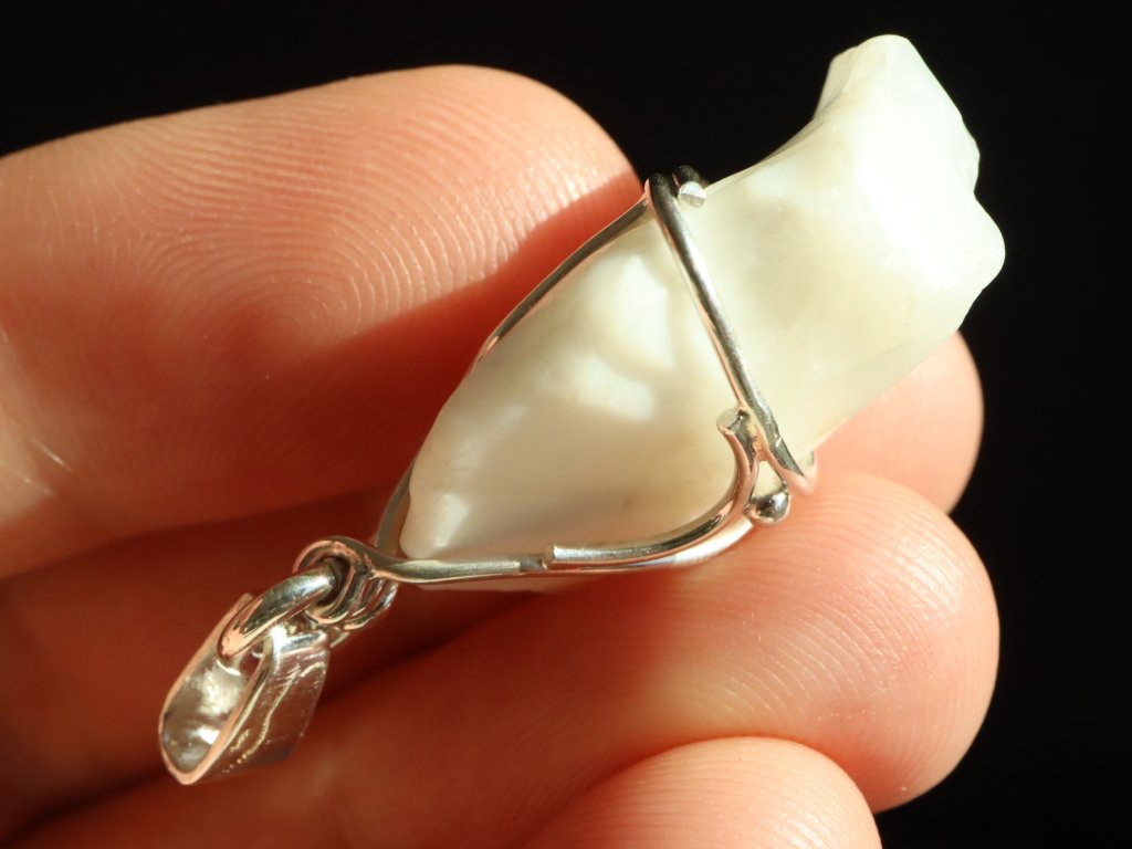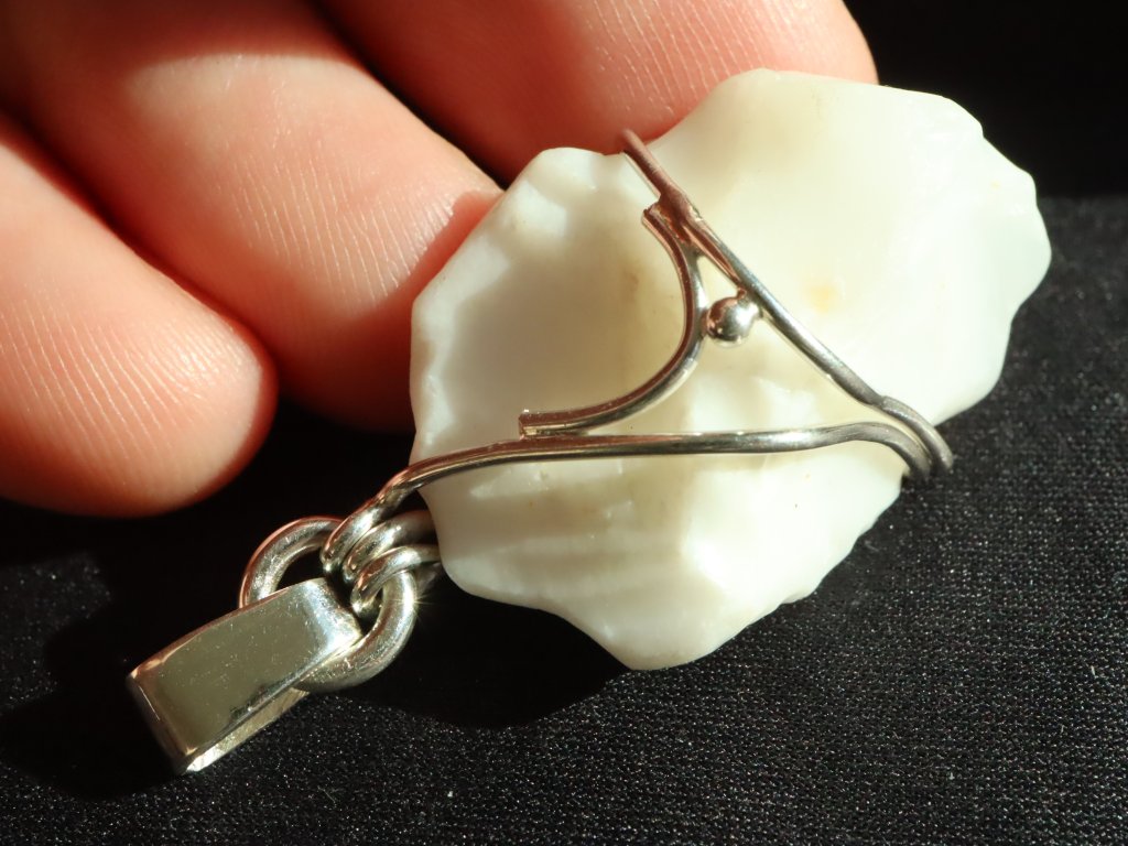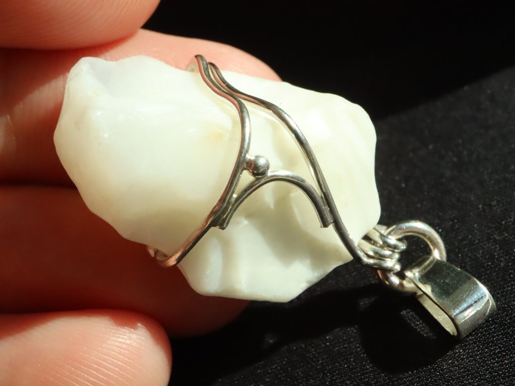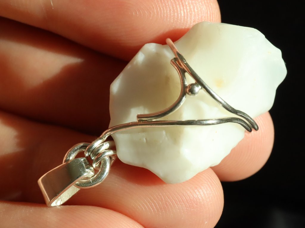V tomto zdobeném přívěsku se můžete kochat krásným sněhově bílým opálem, který má na omak příjemný "voskový" povrch.