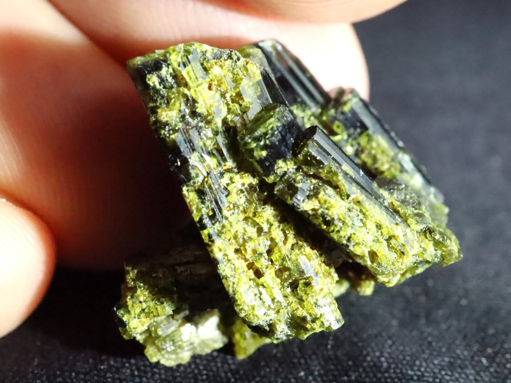 Jedná se o pěknou srostlici tvořenou několika většími sloupcovitými krystalky epidotu.