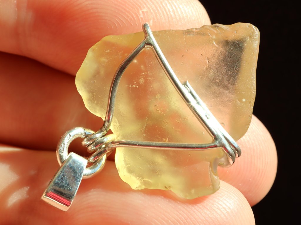 Libyjské sklo je nápaditě a precizně zasazeno ve stříbře (925/1000). Jedná se o jedinečný šperk s čistě přírodním a surovým kamenem (tektitem), který není žádným způsobem opracovaný a je ponechaný v původním stavu, ve kterém byl nalezen.