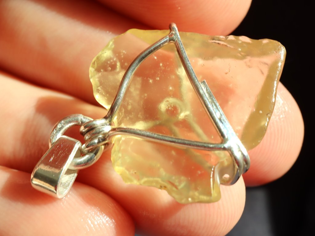 Velmi kvalitní a estetický kousek libyjského pouštního skla v precizně zpracovaném a zdobeném stříbrném přívěsku.