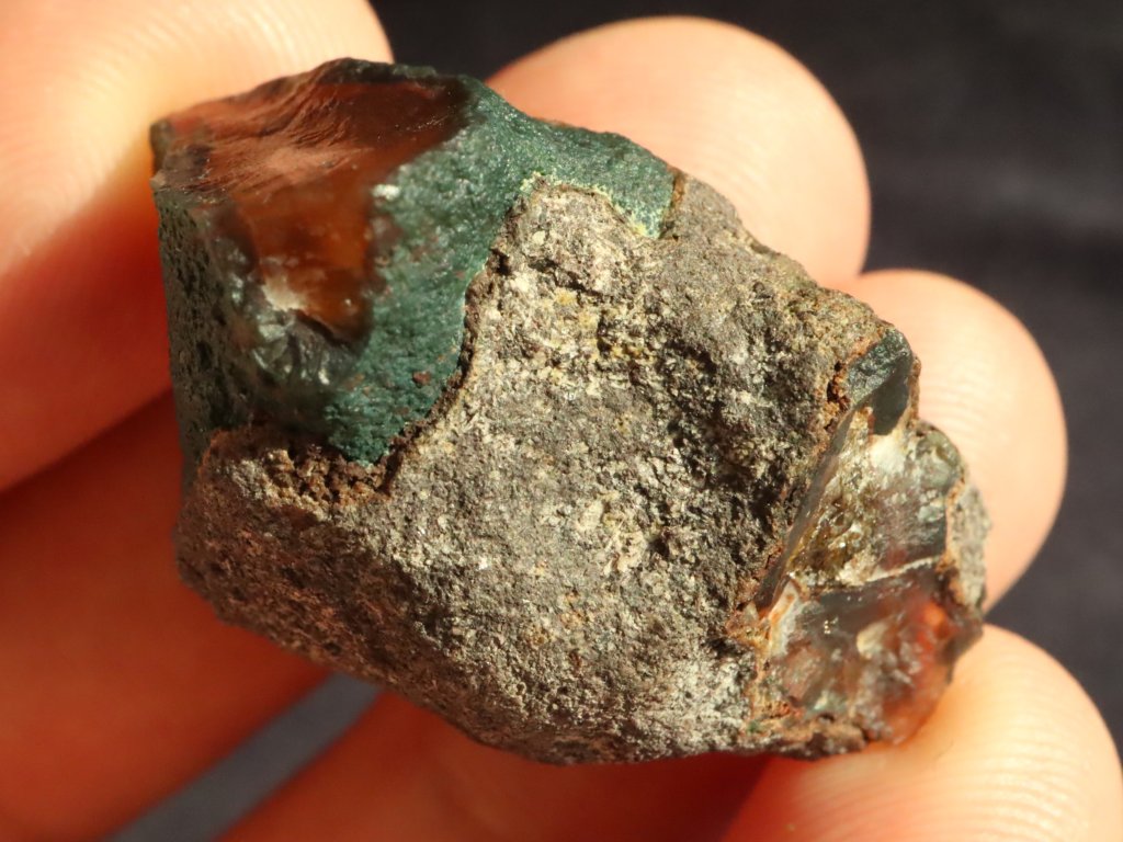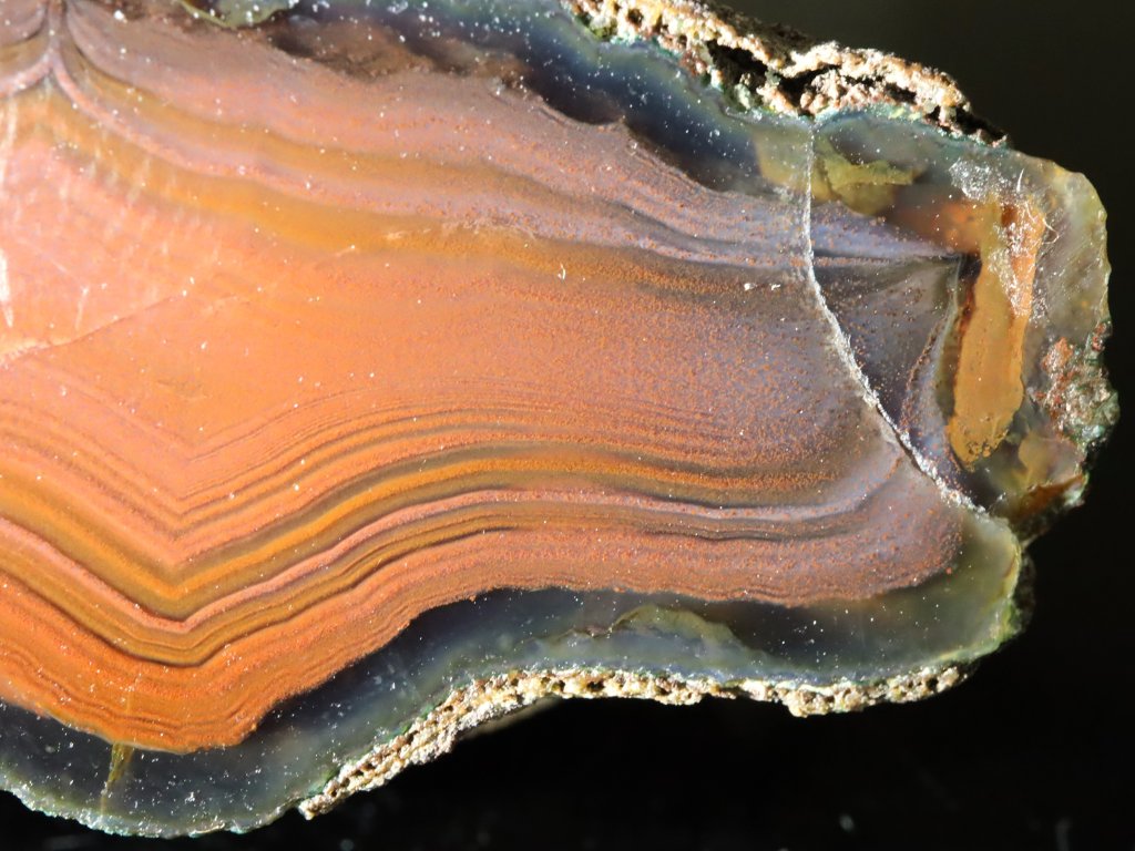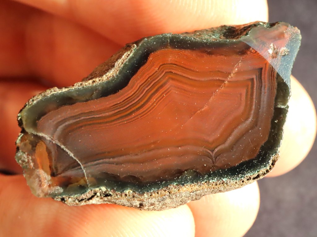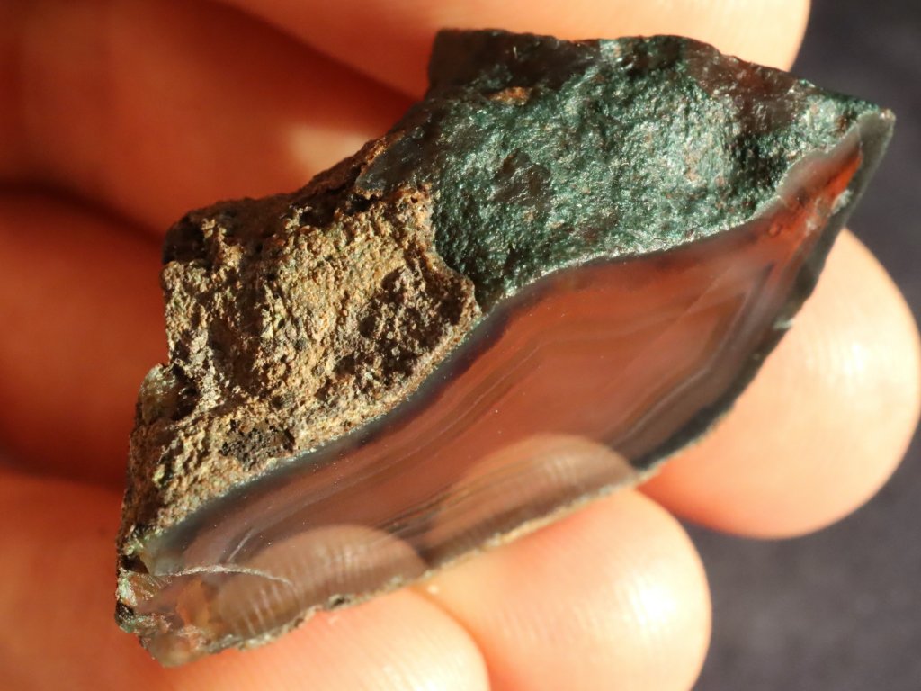 Úvodní čtyři snímky zachycují achát na sluníčku, poslední dvě fotografie pak při nasvícení baterkou. Na běžném denním světle / ve stínu je pak achát mimořádně tmavý / temný (červeno-hnědý až takřka černý).