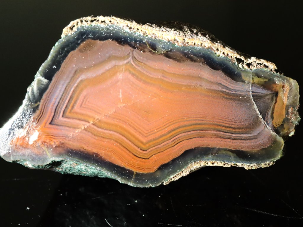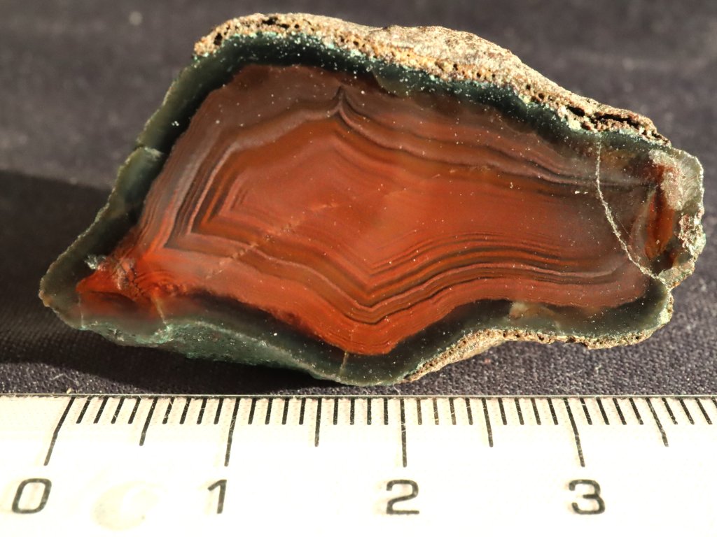 Vyleštěná polovina achátové pecky s velmi temnou červeno-hnědou barvou a černým lemem.
