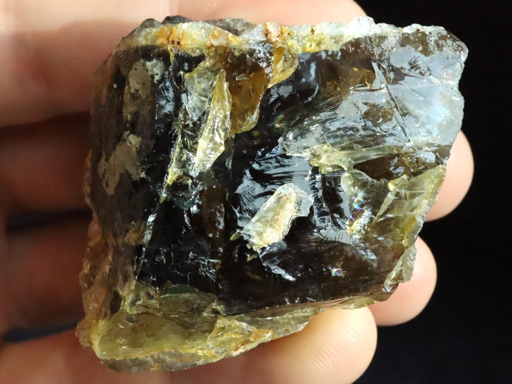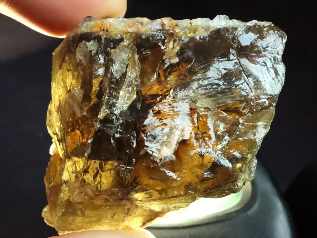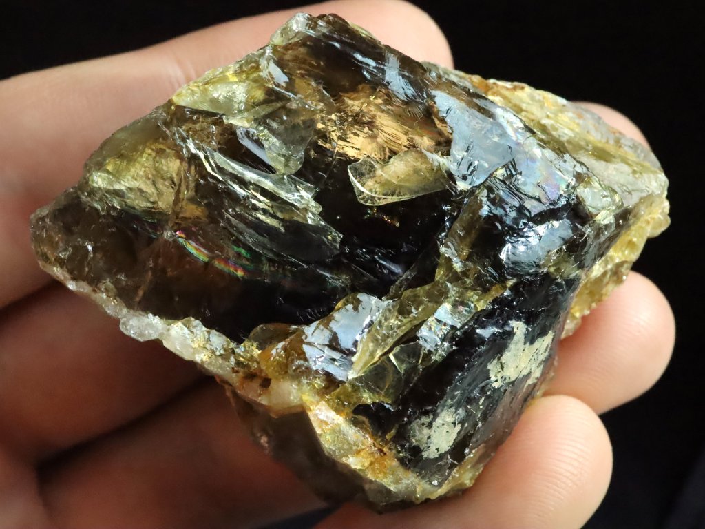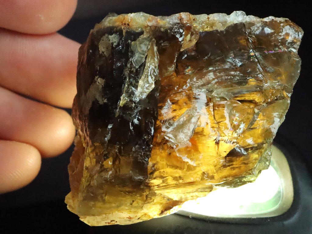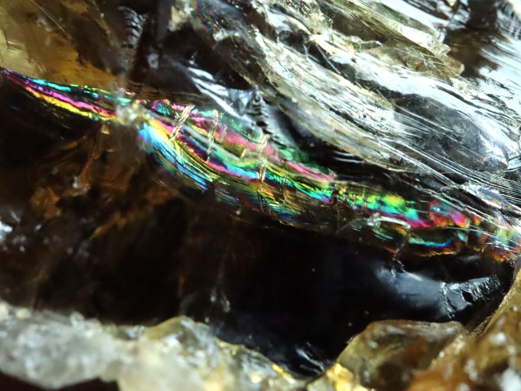 Morion má ve stínu temnou až černou barvu, při prosvícení sluníčkem či baterkou se pak částečně rozzáří podmanivými hnědými odstíny - To jsme pro vás zachytili na posledních dvou fotografiích. Spatřit tu můžete i malou barevnou duhu (viz. detail třetího snímku).