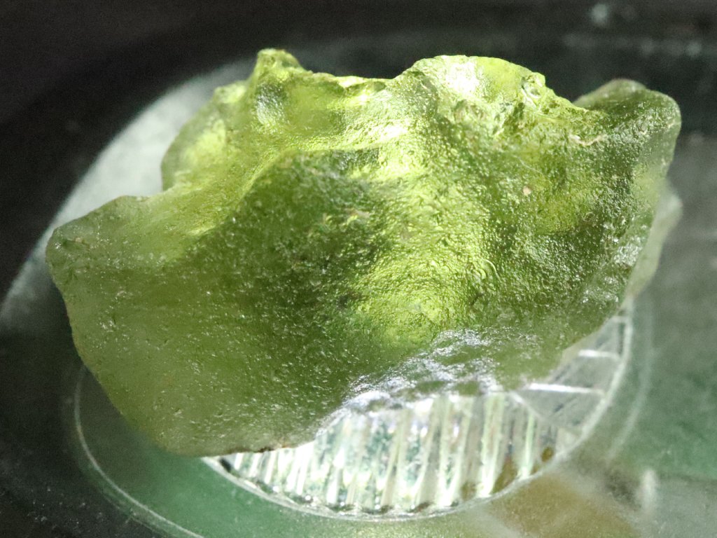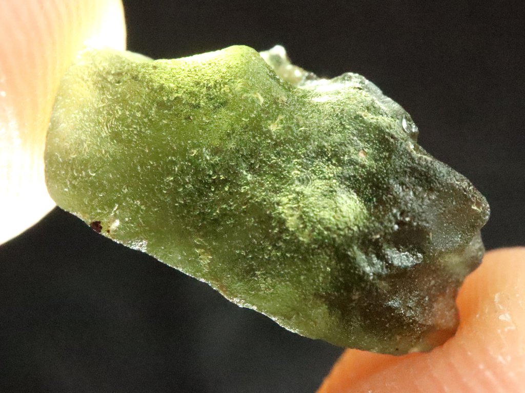 Povedený vzorek pravého českého vltavínu s podmanivou tmavší lahvově zelenou barvou.