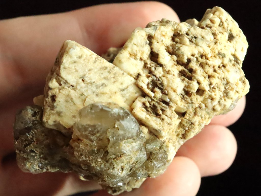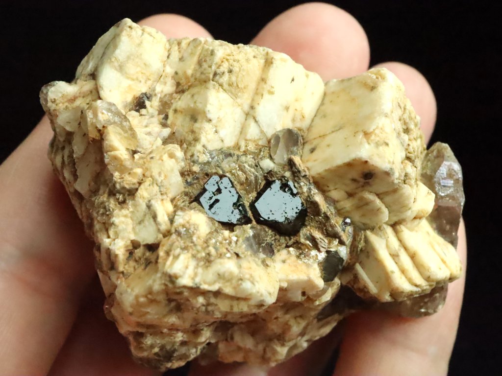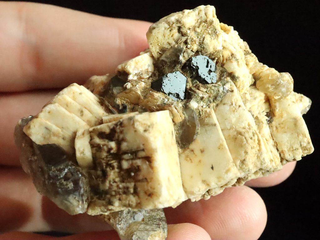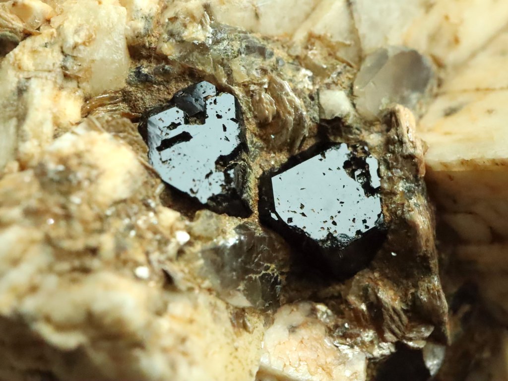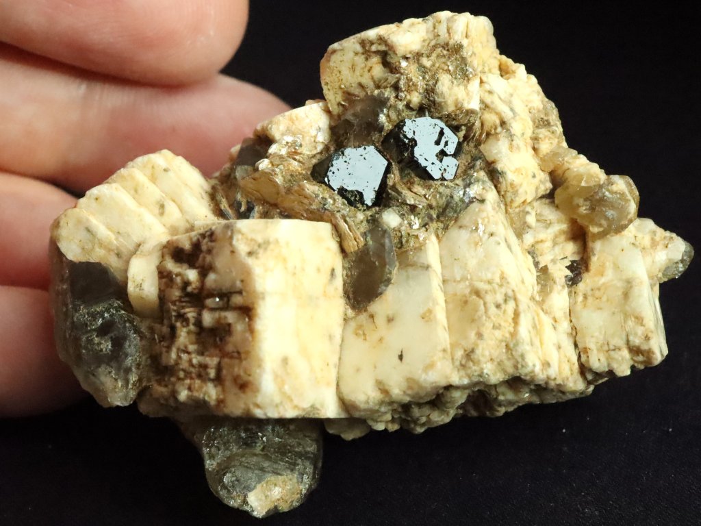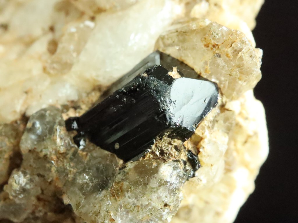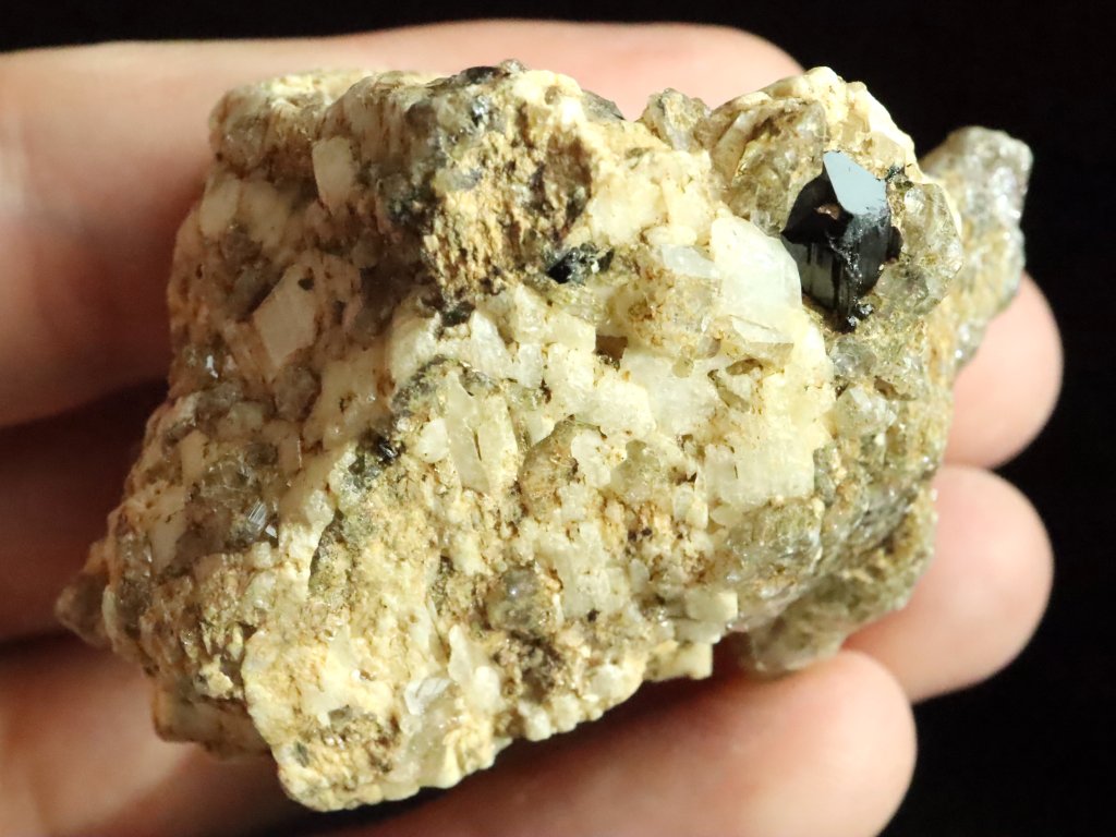 Nejmenší, ale nejvzácnější jsou pak na tomto kameni černé turmalíny skoryly. Najdete tu celkem tři kousky, respektive zarostlé malé špalíky, které se však pyšní dokonalým estetickým zakončením ze své pohledové čelní strany.