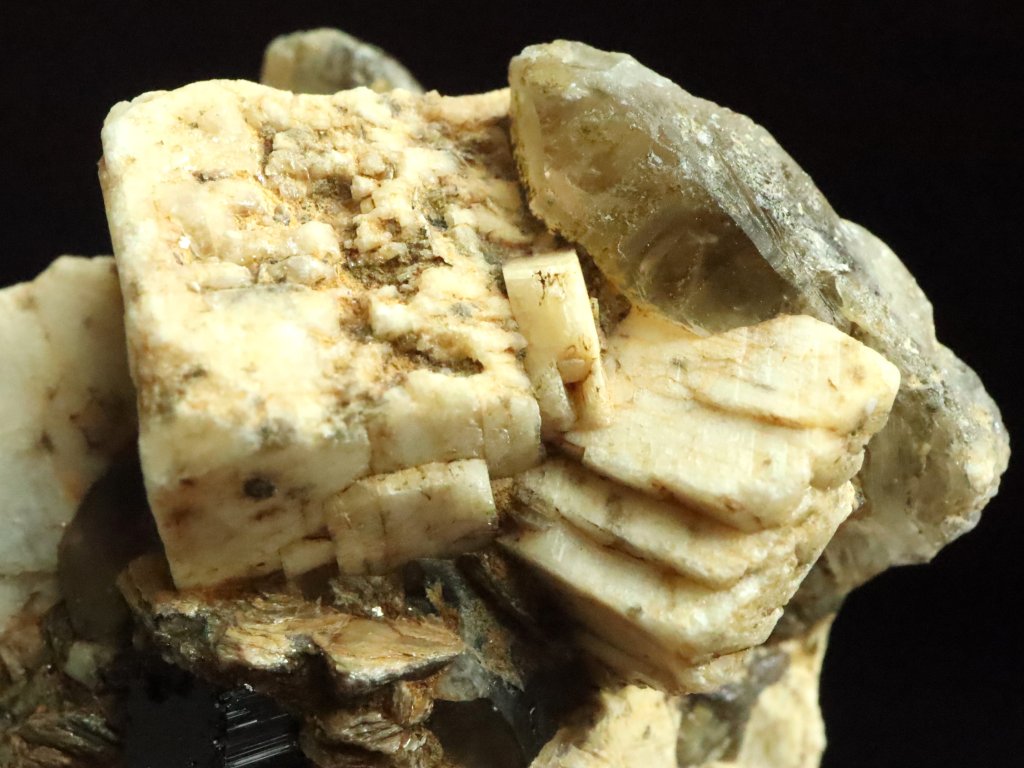 Dále se tu nachází i menší krystalek kouřové záhnědy, šedý křemen, nebo drobné stopy muskovitu (stříbrné slídy).