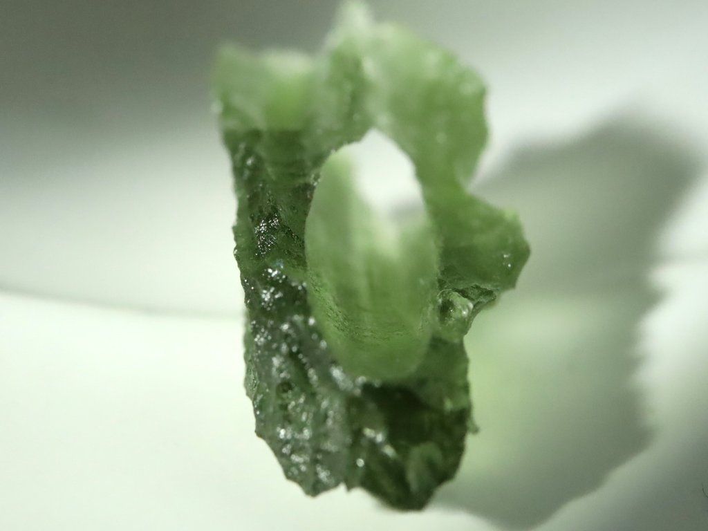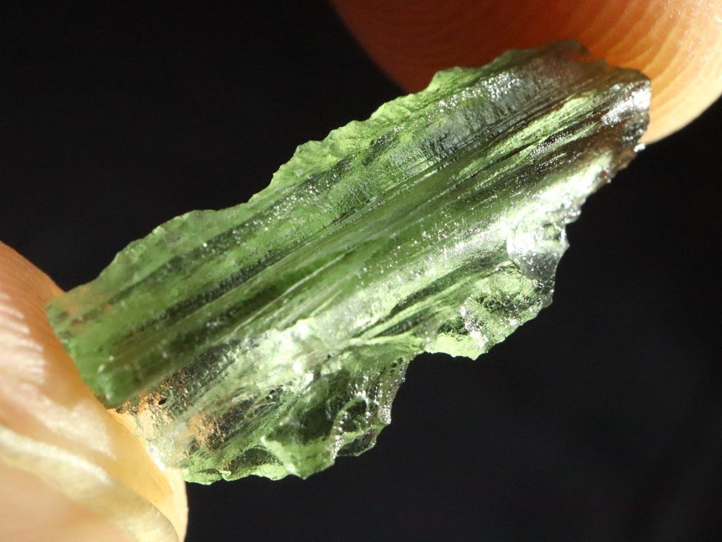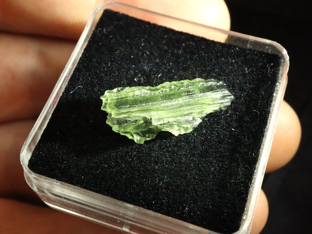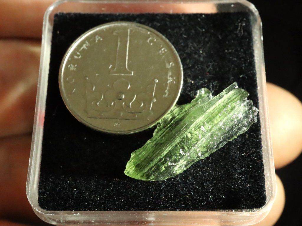 Přírodní vltavín s váhou 0,85 gramu, pocházející z oblasti jižních Čech.