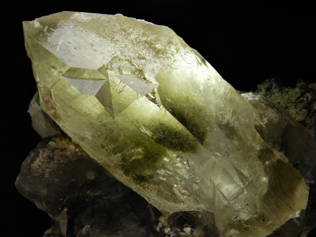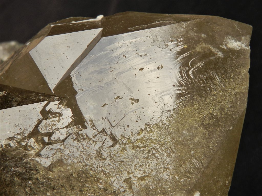 Ti pozornější z vás uvnitř krystalu dokonce objeví i náznak tzv. Fantomu, neboli dalšího krystalu. V našem konkrétním případě lze uvnitř spatřit část špice, restektivě dvě její plošky. Ty jsou viditelně pokryté zeleným chloritem, což jasně dokládá přerušovaný růst tohoto krystalu - tedy úkaz označovaný jako Fantom.