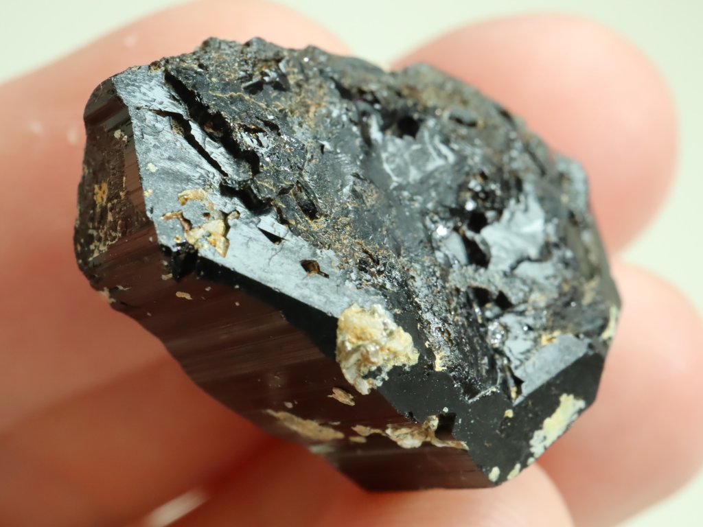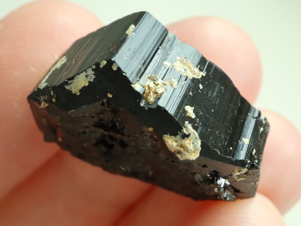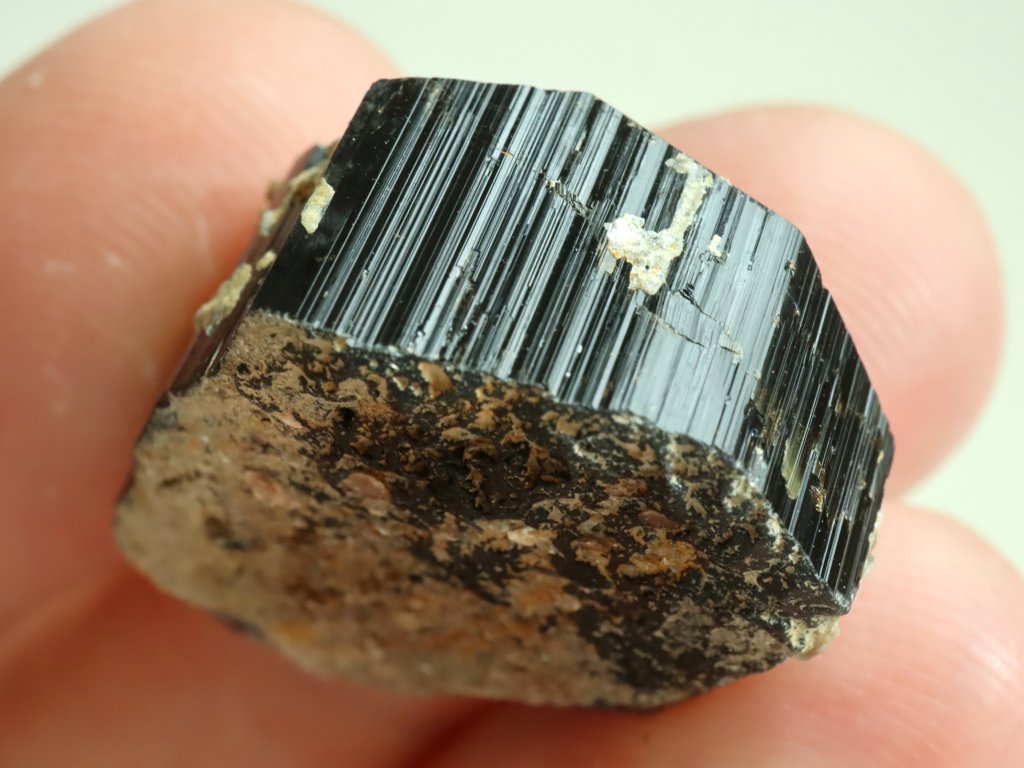 Turmalín má zajímavý úzký tvar (plochý špalík) a z jedné čelní strany má pěkný náznak ukončení spou s otlačením.