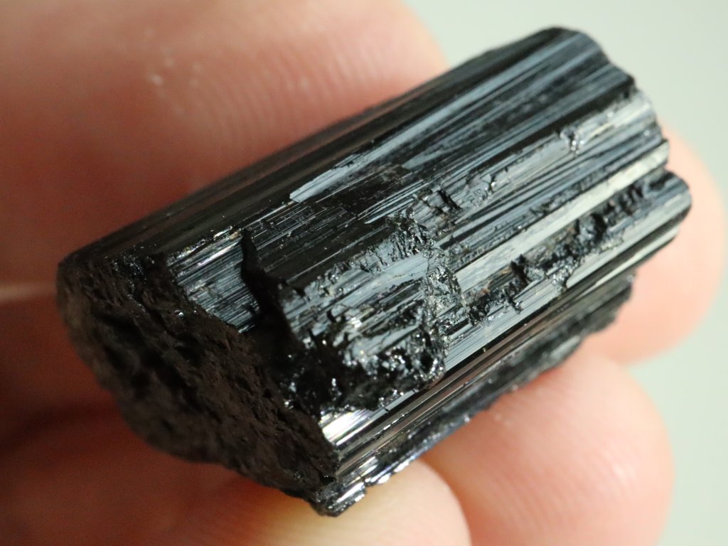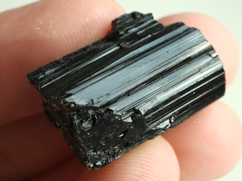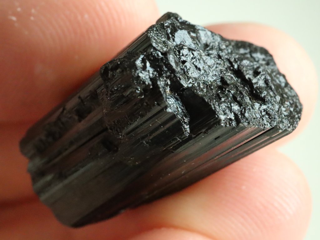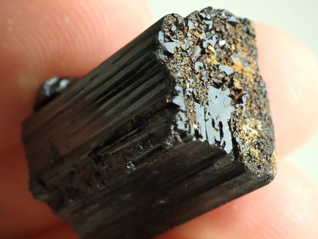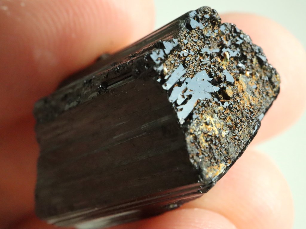 Tento turmalín patří mezi ty vzácnější, z jedné čelní strany se totiž může pochlubit částečným ukončením, které se označuje jako "dohojení" a tvoří jej drobné lesklé plošky - viz. foto.