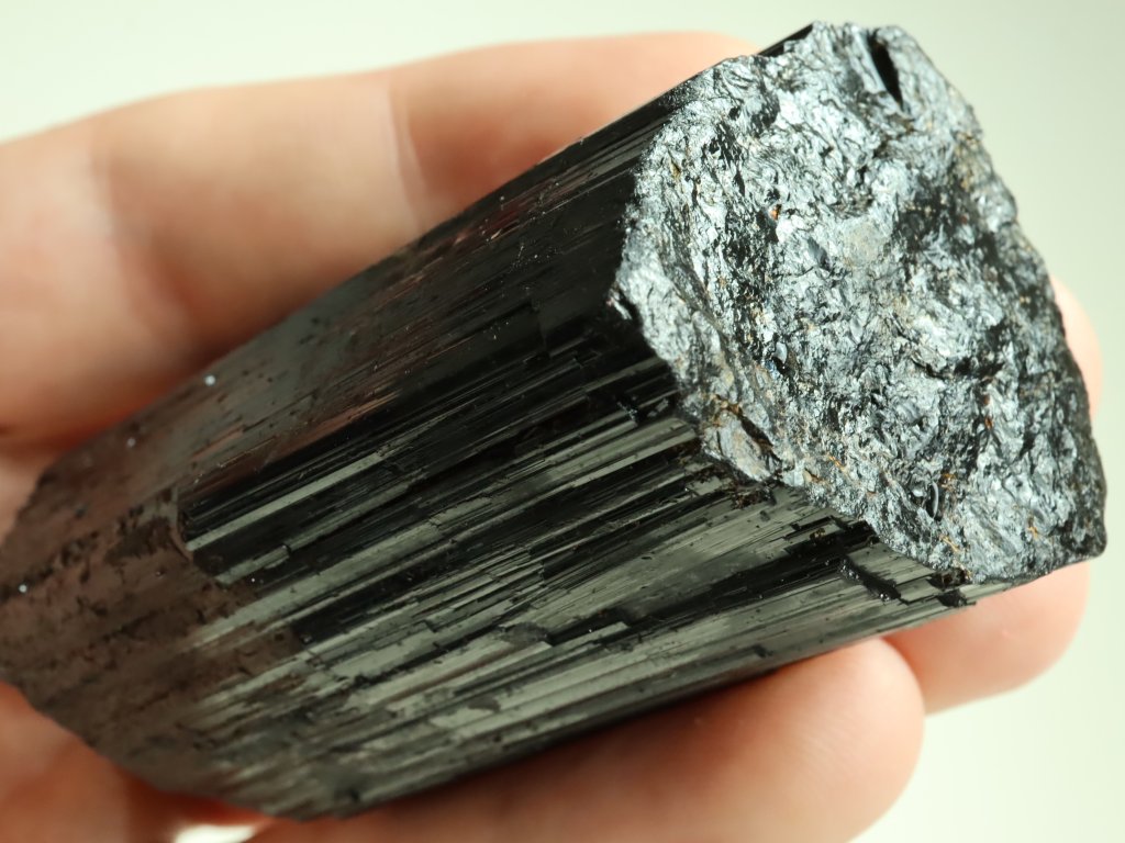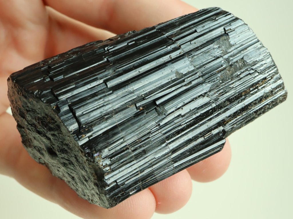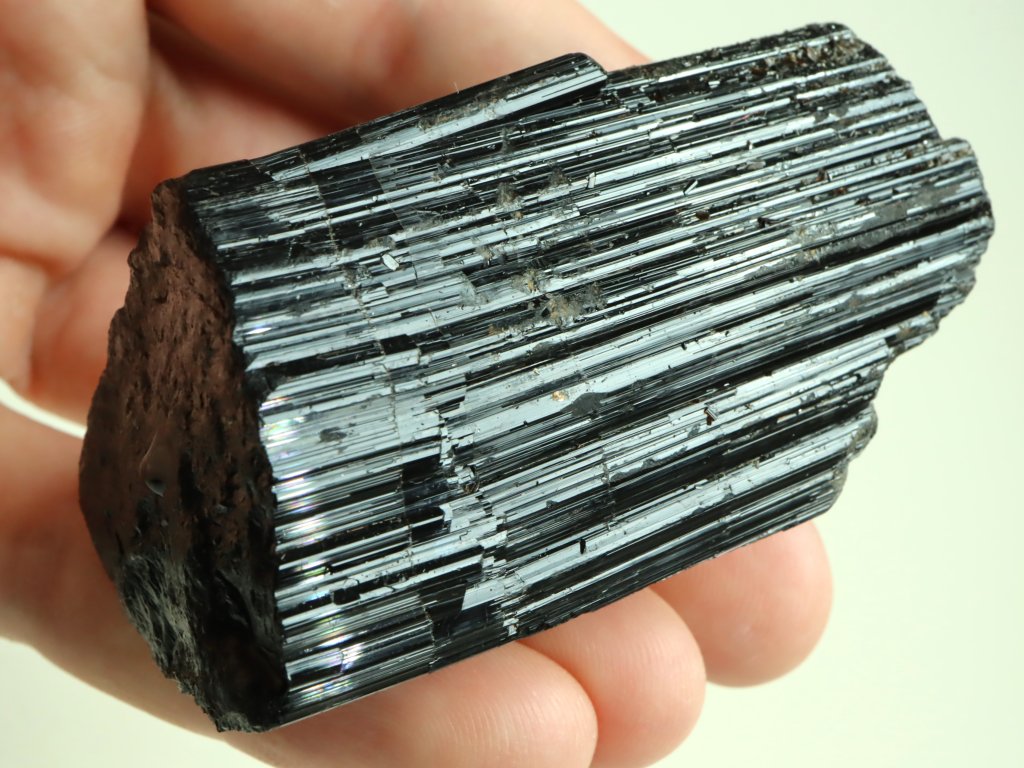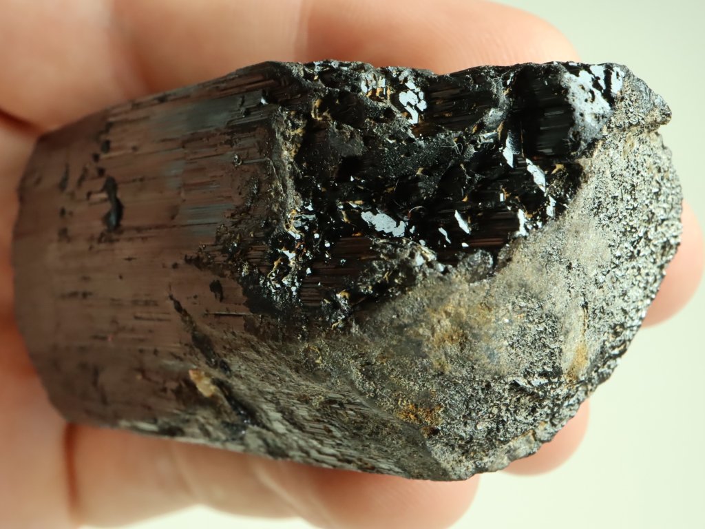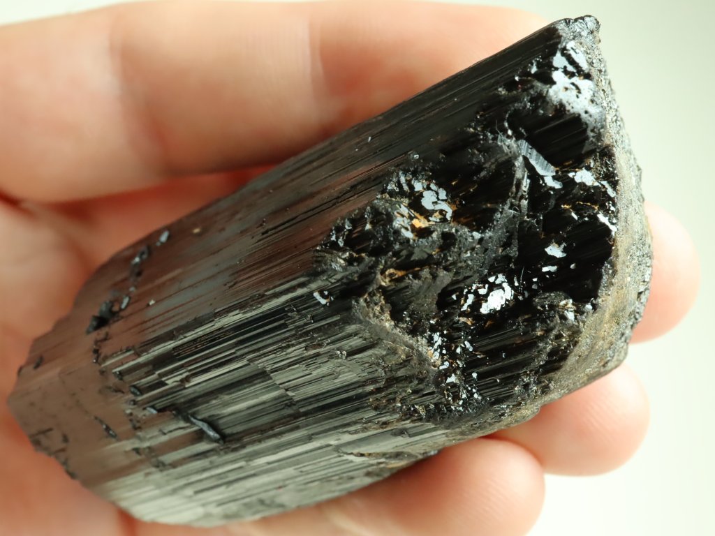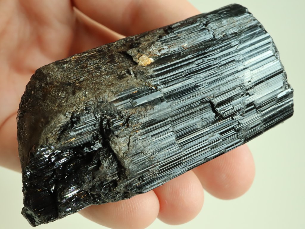 Tento vyjímečný vzorek černého turmalínu si zamilujete na první pohled, jde totiž o velký spíše až mohutný podlouhlý špalek, který vyniká skutečně mimořádně vysokým leskem a k tomu ještě fantastickým estetickým rýhováním po celém svém obvodu.