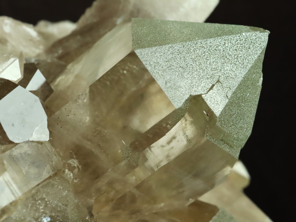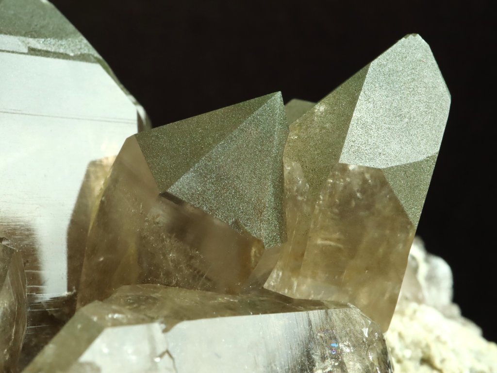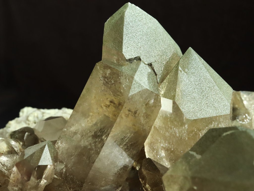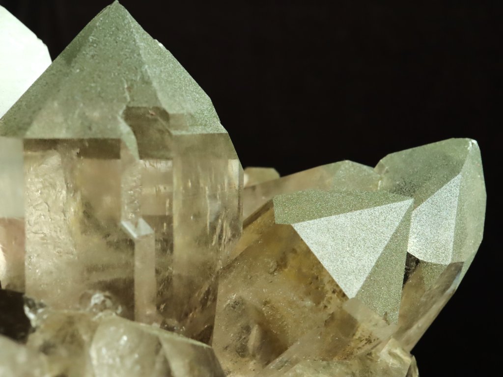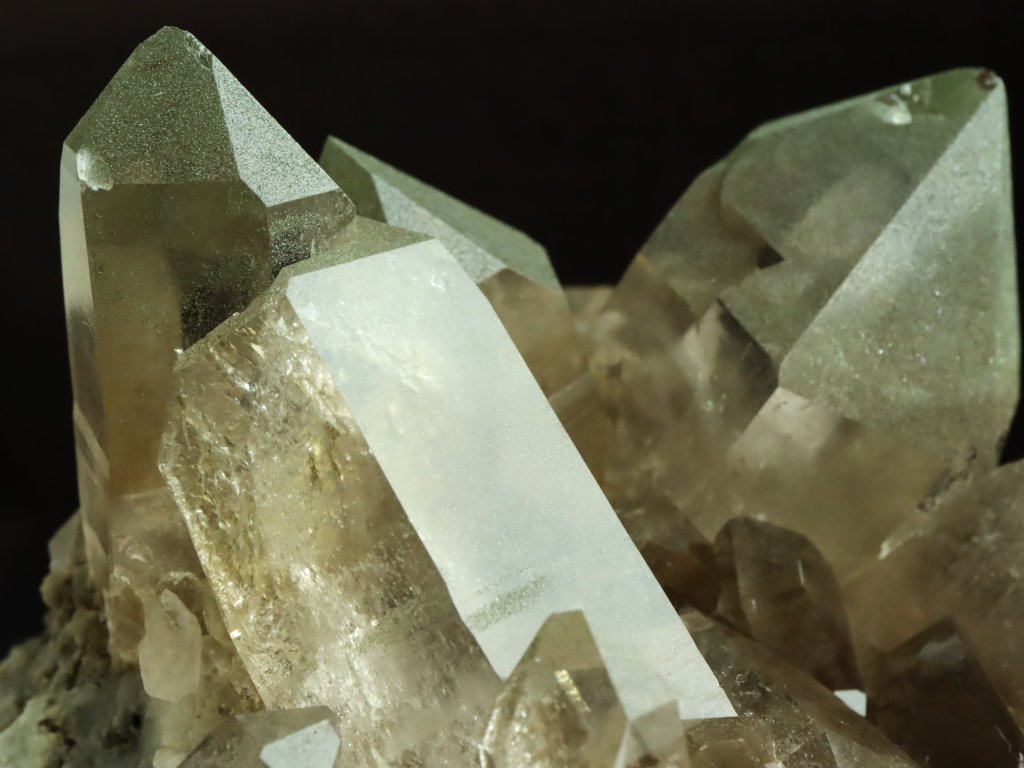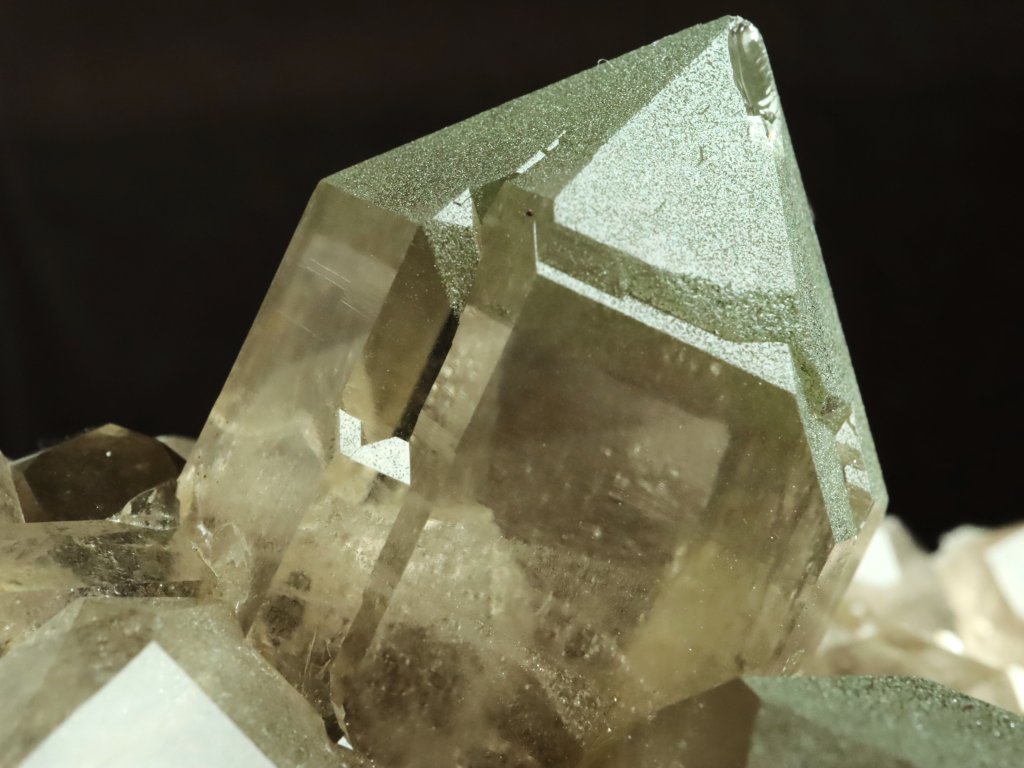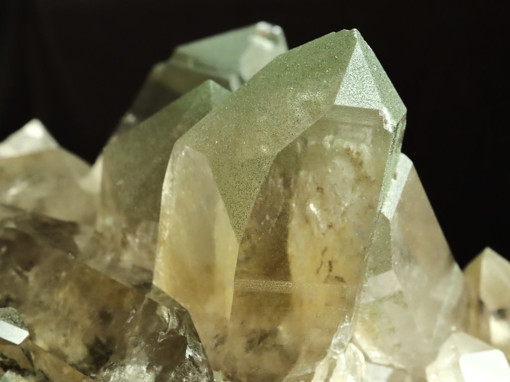 Charakteristický je pro většinu alpských křišťálů i zajímavý lehce třpytivý povlak tmavšího nazelenalého chloritu. Ten mají krystaly na svých špicích.