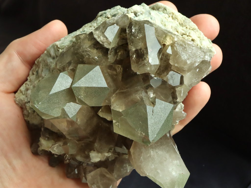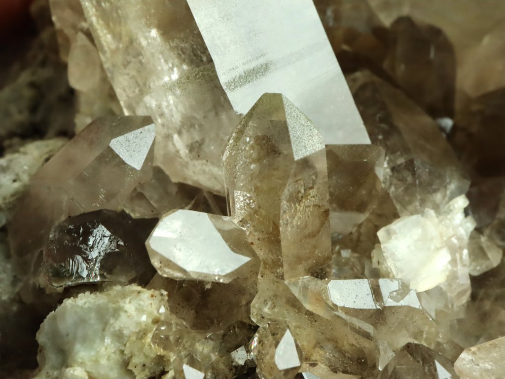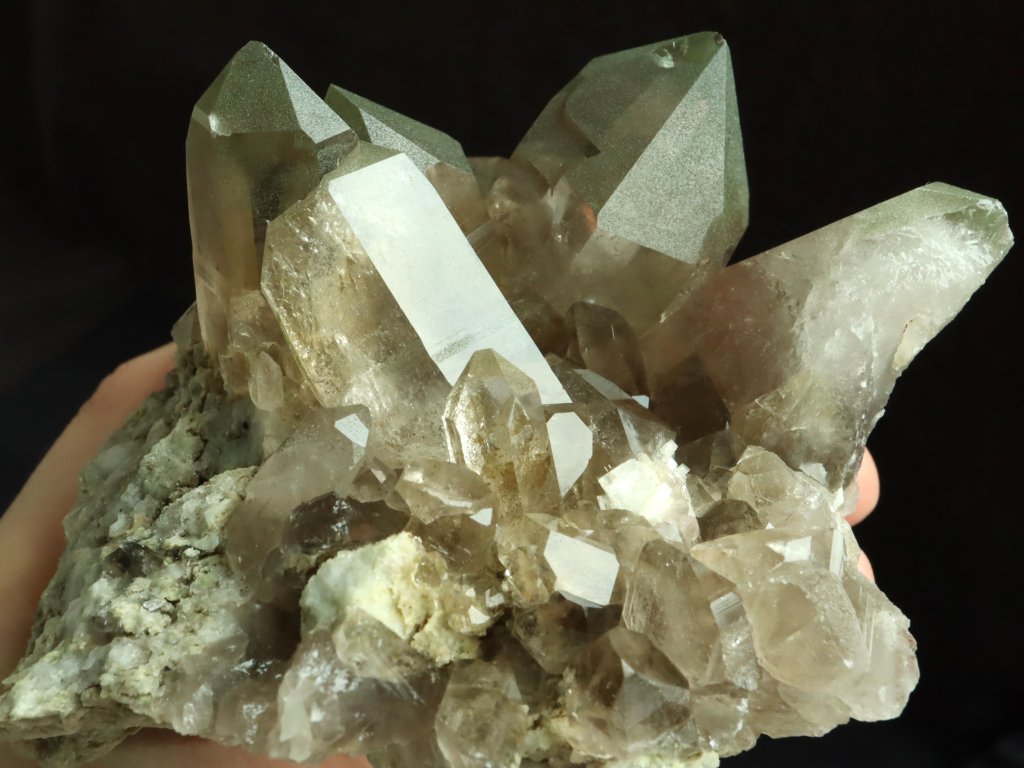 Svým zbarvením se krystaly řadí na pomezí bílého křišťálu a jemně kouřové záhnědy, nutno však dodat, že právě alpské křišťály jsou typické svým světle kouřovým nádechem, takže osobě bychom tuto drůzu spíše označili jako křišťálovou (Typický alpský křišťál s jemně kouřovými tóny).