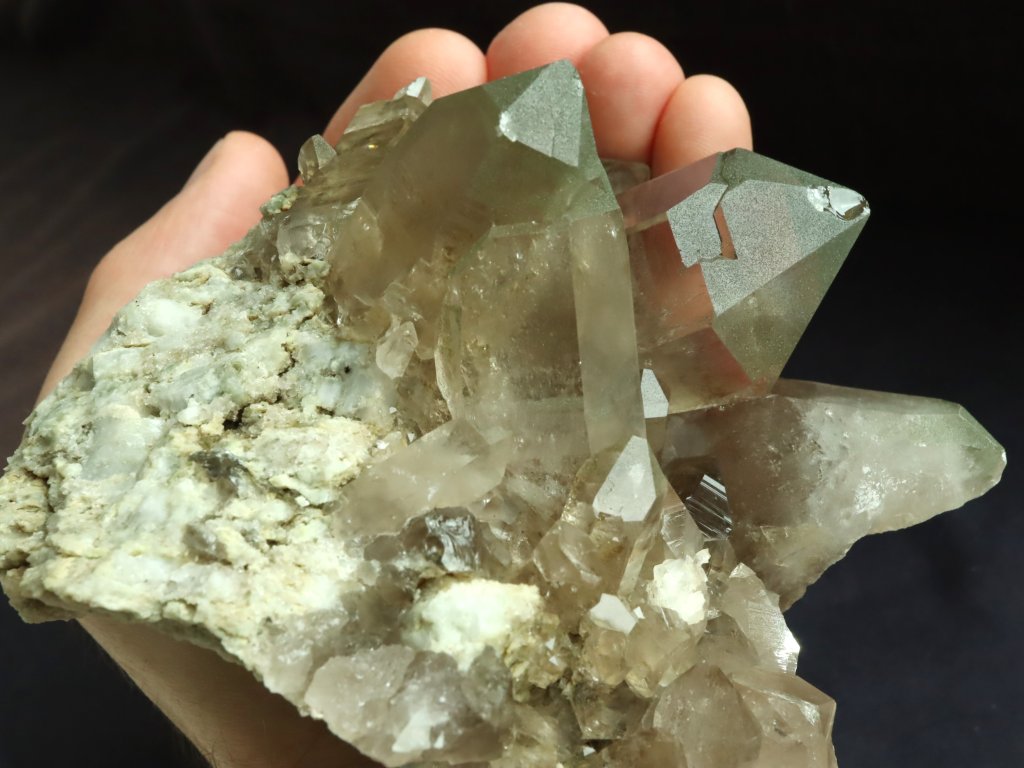 Krystaly jsou sluníčkem či baterkou také výborně průsvitné, lesklé obvodové stěny pak dovolují při tomto prosvícení i výborně nahlédnout do vnitřního světa. Tam se ukrývá především vysoká až drahokamová čistota, některé špice jsou však i půvabně protkány mlhovinovými závoji.