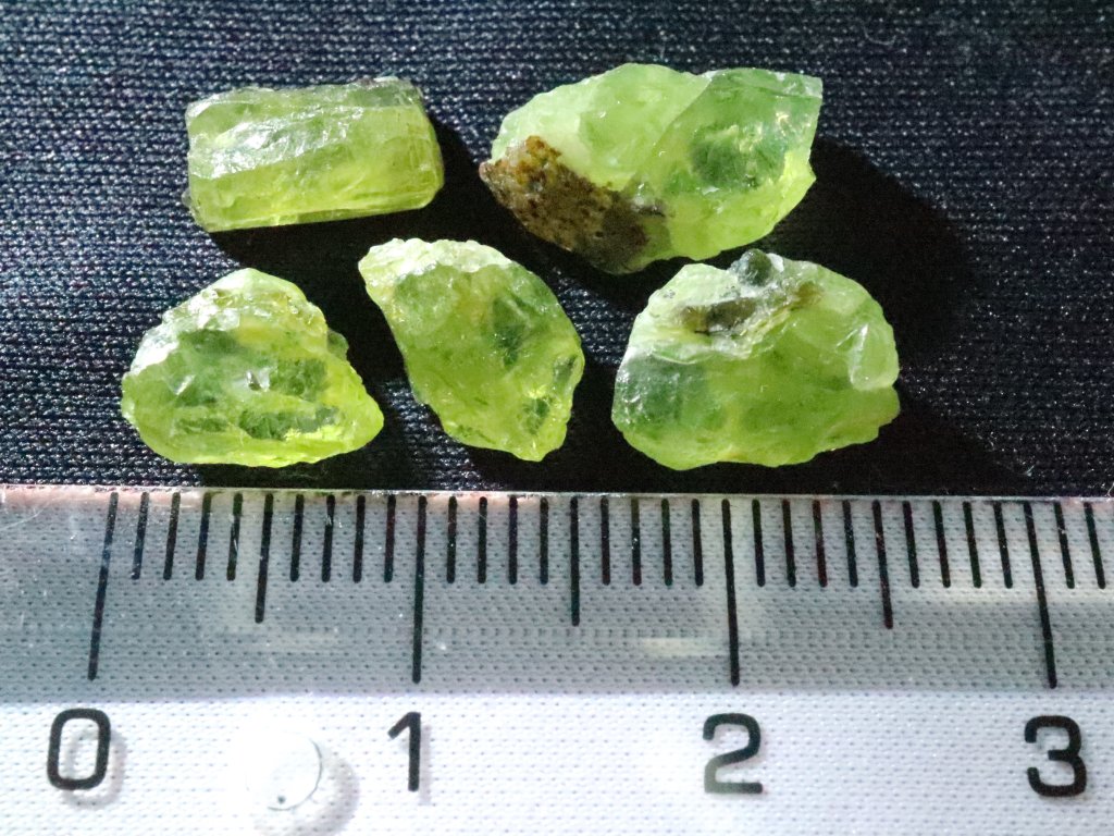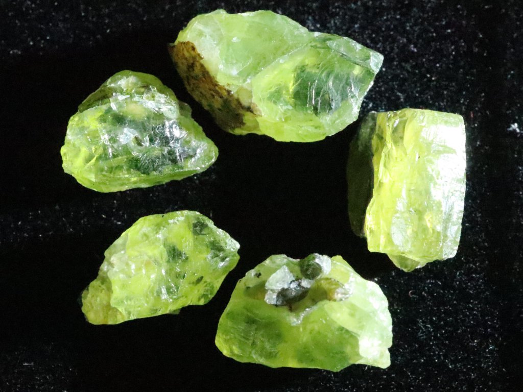 Série pěti krystalových zrn olivinu z naleziště Smrčí (Podkrkonoší).