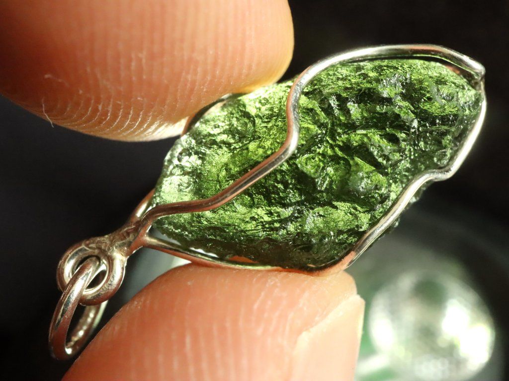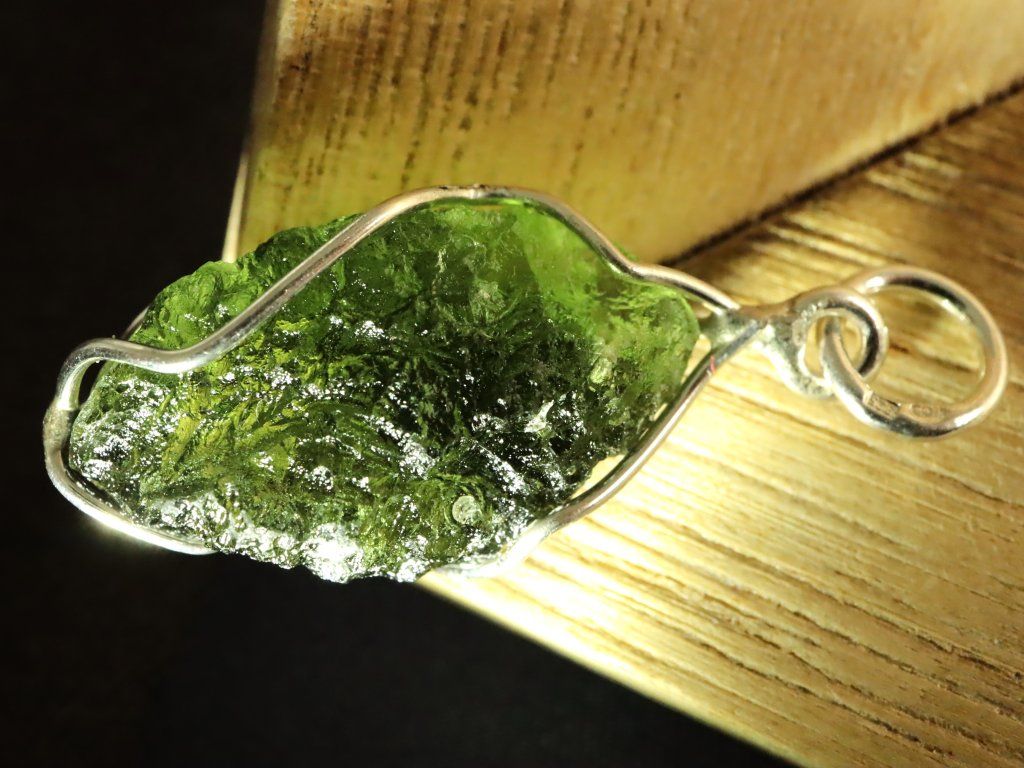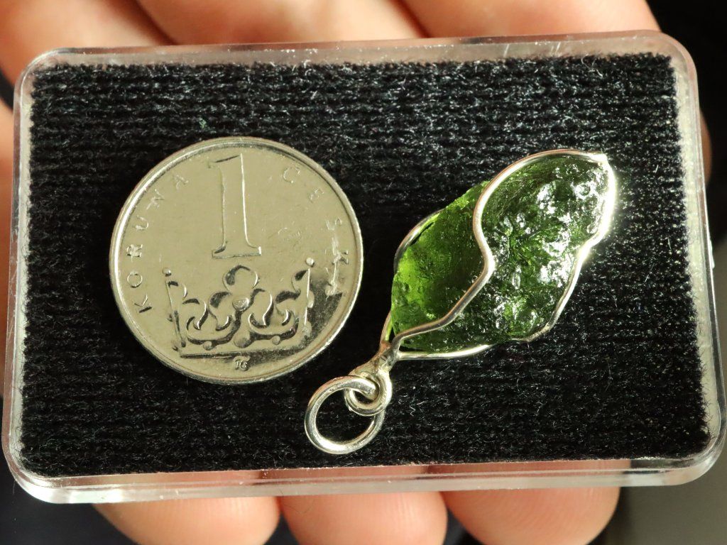 Pohledný kousek pravého přírodního vltavínu z jižních Čech, zasazený ve stříbrném přívěsku.