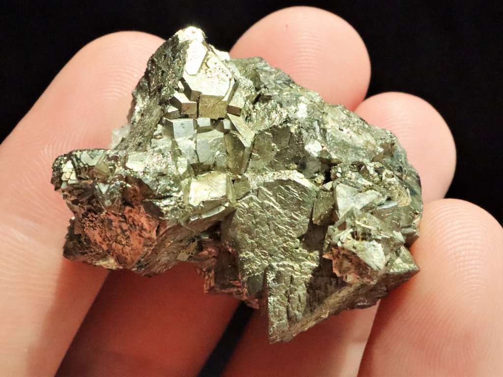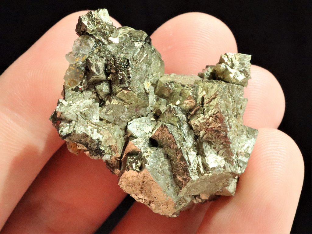 Minerál pyrit má na 90 různých krystalových tvarů. Asi nejznámějším je kostka nebo-li krychle, často se však také setkáte s tzv. pentagonem (pětiúhelníkový dvanáctistěn) nebo osmistěnem. Na této konkrétní pyritové srostlici můžete objevit hned několik tvarů krystalů.