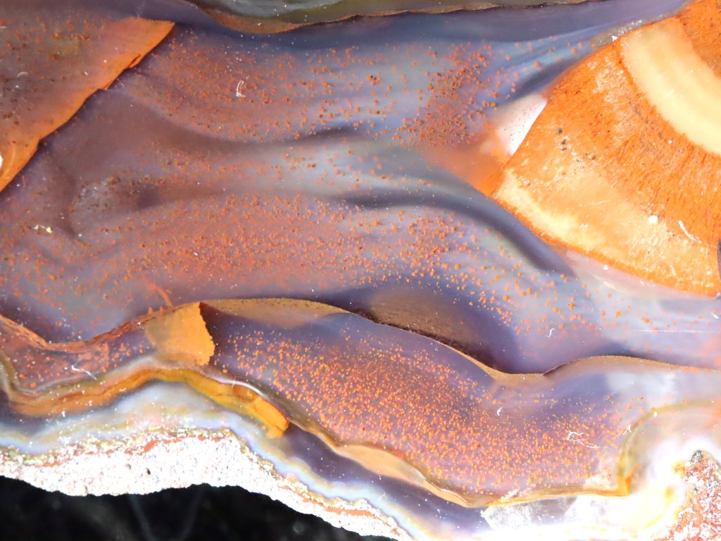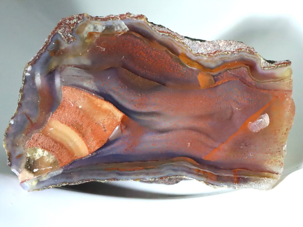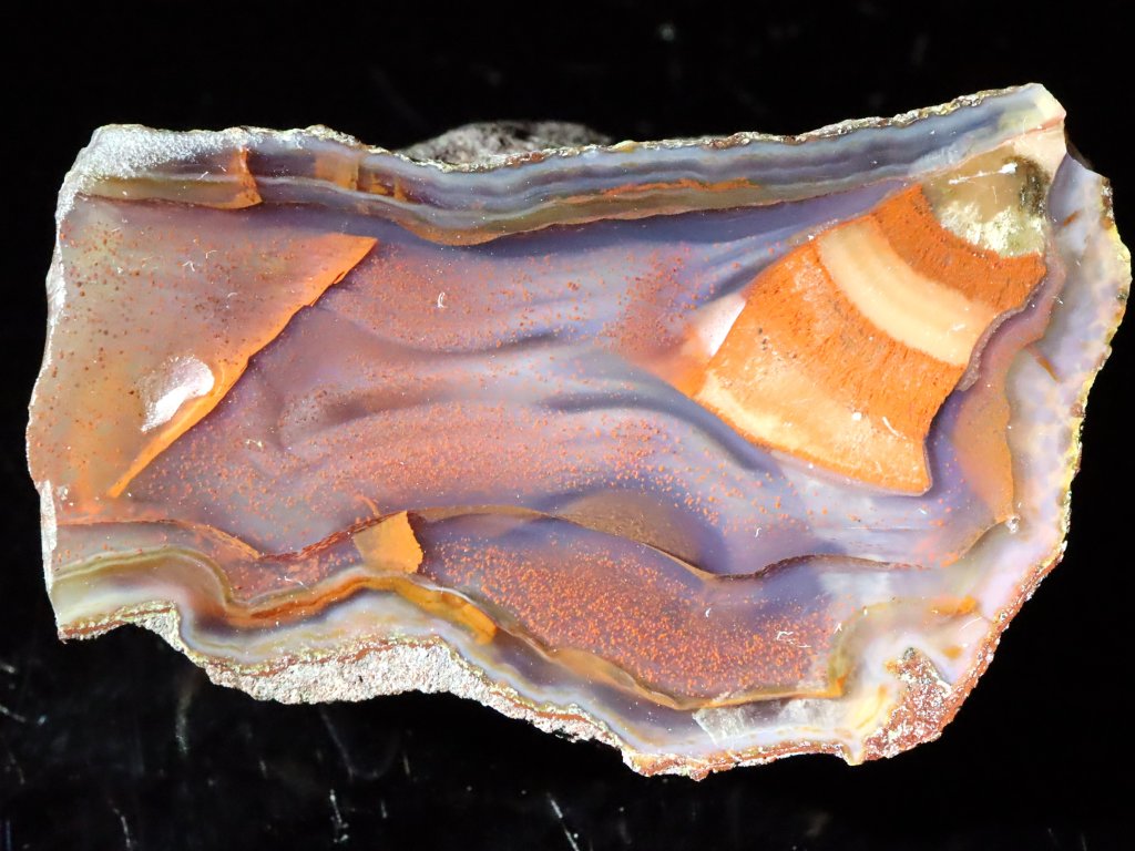 Pohledný vzorek seříznutého a vyleštěného achátu, který si zamilujete díky jeho podmanivé hře barev, kde převládá oranžová, jemně fialková a bílá.