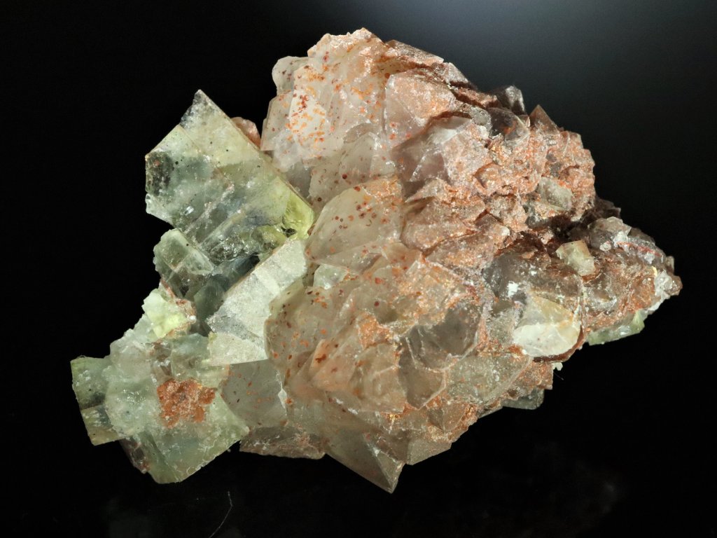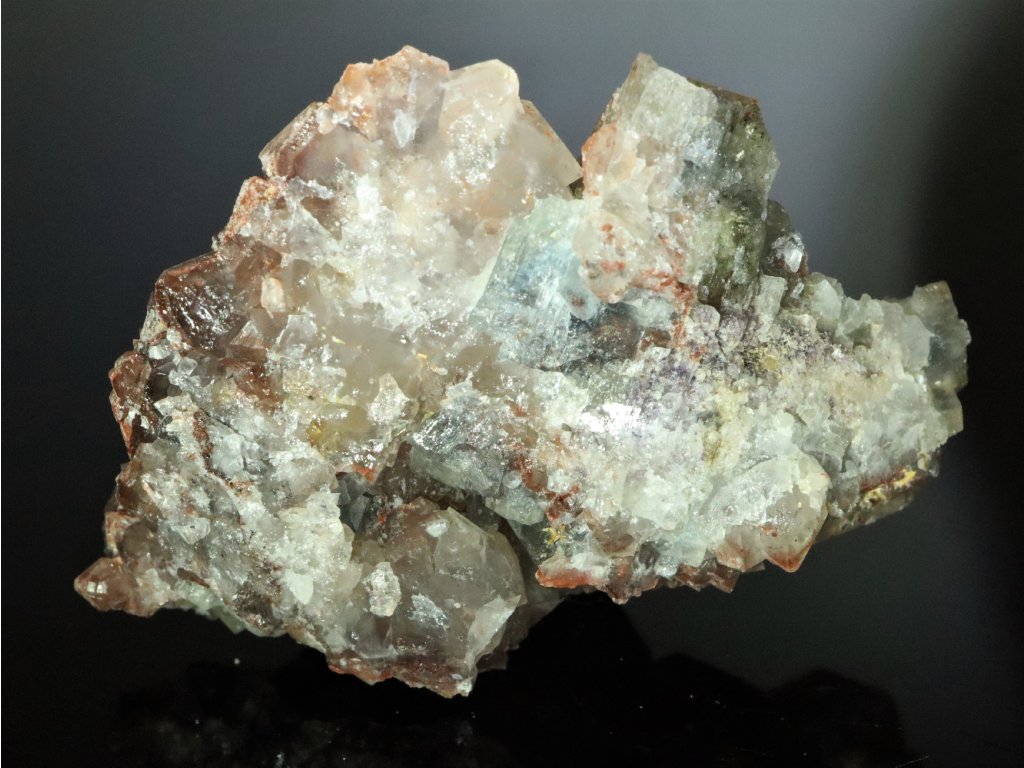 Můžete se zde kochat kostičkami lehce nazalenalého fluoritu spolu s drůzičkou křemene tvořenou množstvím drobných špiček. Tyto křemenné krystalky pak ještě místy pokrývá slabý povlak hnědo-červeného hematitu.